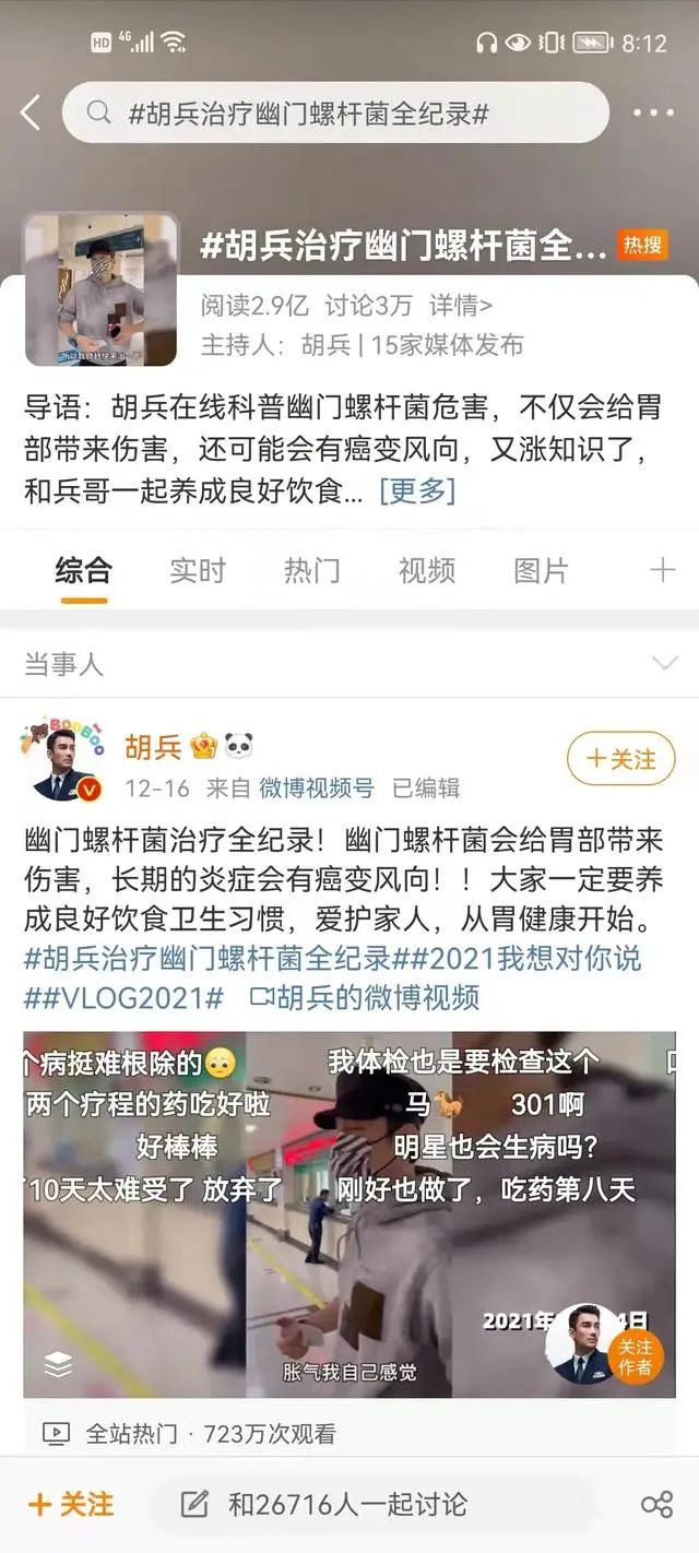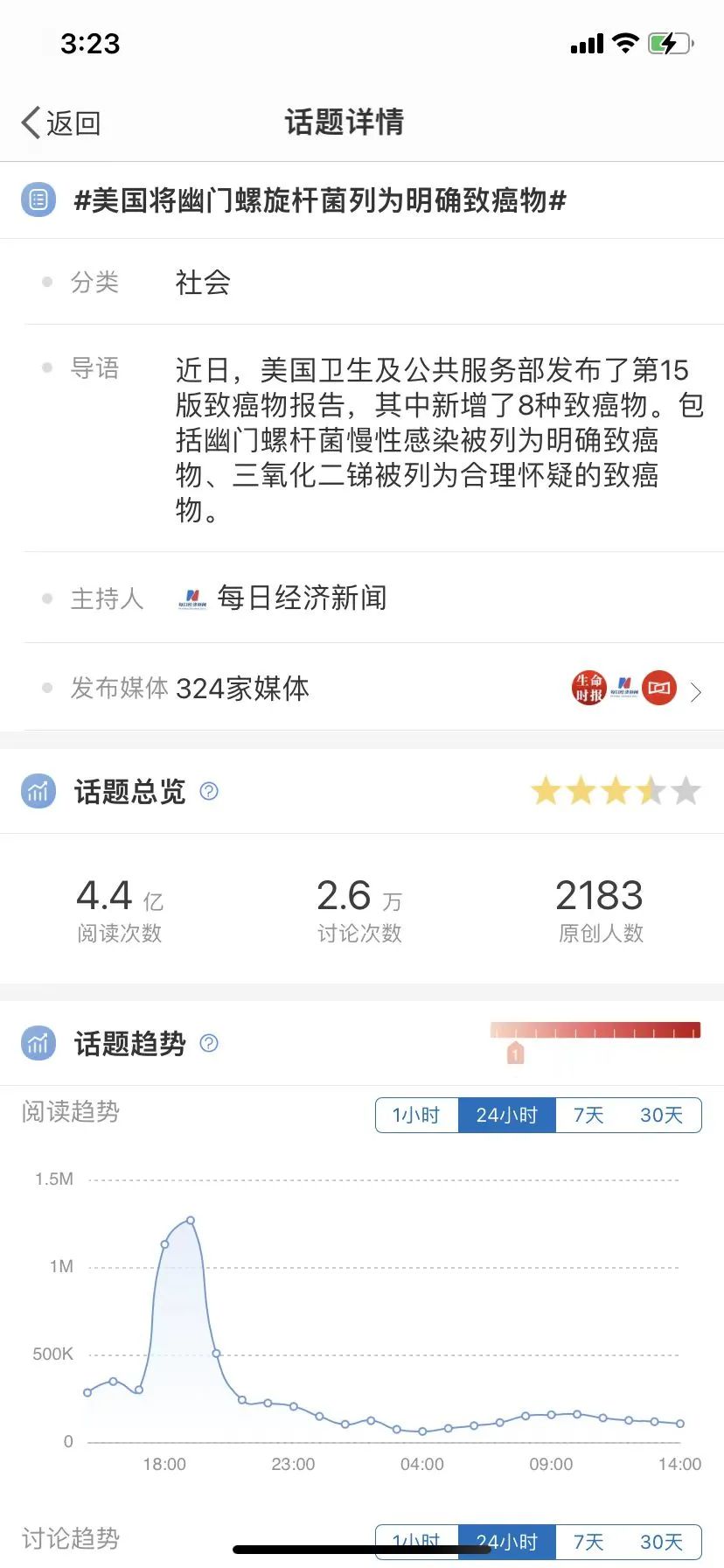 在微博上,出现了一个324家媒体参与的话题#美国把幽门螺旋杆菌列为明确致癌物#,超过4亿的话题阅读,彻底引爆,在1月5号登上微博热搜。央视随即也参与了报道。