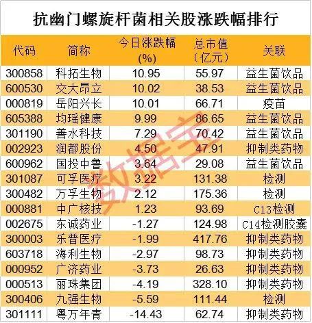 受到此消息的影响,1月5日,所有市面上防治或治疗幽门螺旋杆菌的概念股表现活跃,好几家涨停了。