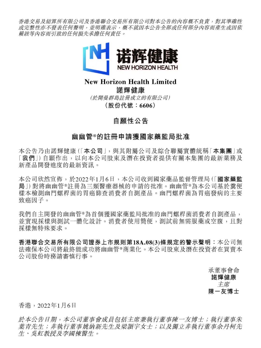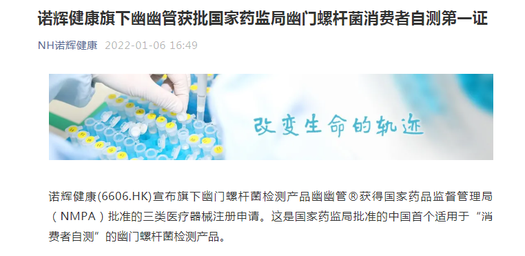 1月6日,诺辉发布公告称幽幽管注册为三类医疗器械获得国家药品监督管理局批准。