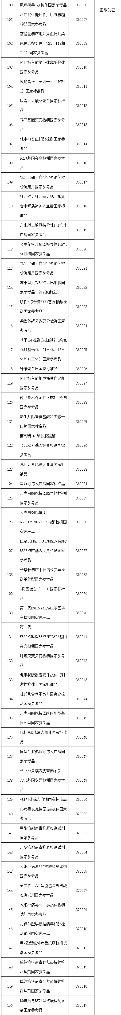 注: 1. *标识品种为本期目录新增体外诊断试剂标准物质。 2. ▲标识品种为可用于体外诊断试剂检验的化学对照品。 3. 相关品种电子版说明书可到中国食品药品检定研究院网站http://aoc.nifdc.org.cn/sell/home/search.html,点击目录查询,进行在线浏览。 4.限制供应是指仅供给相关体外诊断试剂生产企业。 5.《注册检验用体外诊断试剂国家标准品和参考品目录(第十一期)》发布之日起,《注册检验用体外诊断试剂国家标准品和参考品目录(第十期)》同时废止。