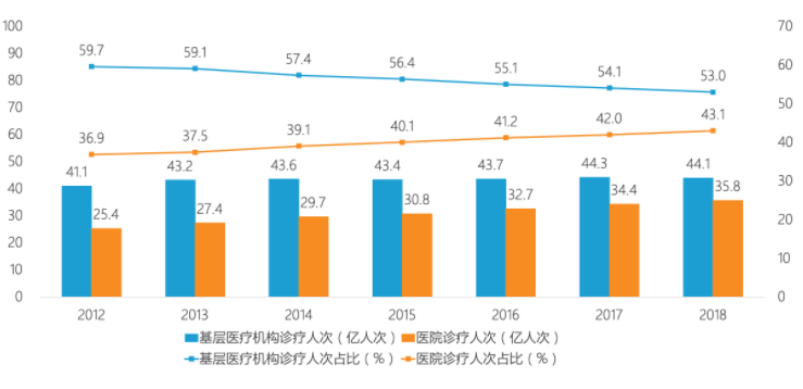“分级诊疗制度实现之日,乃是我国医疗体制改革成功之时。” ——国家卫生健康委主任马晓伟 2015年9月,国家层面发布《关于推进分级诊疗制度建设的指导意见》作为建立分级诊疗制度的总纲领,明确提出“引导优质医疗资源下沉,形成科学合理就医秩序,逐步建立符合国情的分级诊疗制度,切实促进基本医疗卫生服务的公平可及。” 推行至今,基本建立“基层首诊、双向转诊、急慢分治、上下联动”的分级诊疗制度,这个目标实现了吗? 数据显示,2012至2018年间基层医疗机构诊疗人次绝对值逐年上升,但相反基层医疗机构占比逐年下降。“分级诊疗”效果并不尽如人意,大医院人满为患、基层医院“门可罗雀”的状况仍未根本缓解。