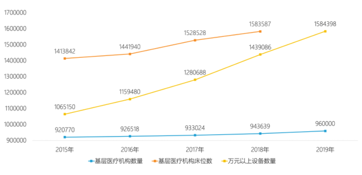 要构建起强大的公共卫生体系,重中之重,是需要强化基层。 《关于推进分级诊疗制度建设的指导意见》提出了以“强基层”为重点完善分级诊疗服务体系,明确基层建设是构建分级诊疗的基础,并提出六大保障措施,通过给予人才激励保障政策、提升县医院综合能力等方式对基层的倾斜支付政策,转变患者“凡病就到大医院“的思想,落实“基层首诊”。 这意味着,基层医疗机构的功能主要是向基层人民提供基本公共卫生服务和基本医疗服务,为诊断明确、病情稳定的慢病患者提供服务,“将常见病留在基层医疗机构诊疗,将疑难杂症转诊到上级医院进一步进行治疗”。 在政策的“保驾护航”之下,基层医疗机构的数量近年来增速加快,2019年已达96万个;基层医疗机构床位数得到保障,2012-2018年间呈现增长趋势;同时,万元以上医疗设备快速补充。