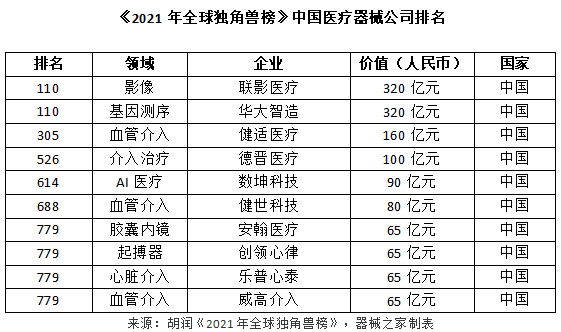联影医疗 上海联影医疗科技股份有限公司(以下简称“联影医疗”)是一家医疗设备和医疗信息化解决方案提供商,为医疗机构提供涵盖影像诊断设备、放疗设备、服务培训、医疗IT的全方位医疗解决方案。 联影医疗于2017年完成了33.3亿元的A轮融资,产品涵盖MR、CT、XR、PET/MR等诊断产品,常规RT、CT引导的RT等放射治疗产品,可满足从临床前科研到诊断再到治疗的需求。2021年12月31日,联影医疗申请科创板上市已获受理,拟募资124.8亿元,将于下一代产品研发、营销服务网络构建、补充流动性资金等。 华大智造 深圳华大智造科技有限公司(简称华大智造)秉承“创新智造引领生命科技”的理念,致力于成为生命科技核心工具缔造者,专注于生命科学与医疗健康领域仪器设备、试剂耗材等相关产品的研发、生产和销售,为精准医疗、精准农业和精准健康等国计民生需求,提供实时(Real Time)、全景(Whole Picture)、全生命周期(Life Long)的全套生命数字化设备和系统解决方案。 自2015年首次在ICG会议上发布第一款国产的拥有自主知识产权的基因测序仪BGISEQ-500以来,华大智造已形成惯例每年在ICG大会上发布组学领域的重要技术和创新产品。在今年10月29日ICG-16大会现场,华大智造宣布对旗下三款主流的测序仪进行了全面的性能升级,针对三大核心业务——基因测序仪、实验室自动化及新业务发布了多项突破性技术和产品,全面赋能生命科学产业发展。 健适医疗 德晋医疗 德晋医疗成立于2015年,专注于二尖瓣和三尖瓣的相关治疗技术的研发。2021年5月8日消息 德诺医疗集团(“德诺医疗”)旗下杭州德晋医疗科技有限公司(以下称“德晋医疗”“公司”)宣布,已于近期完成B轮融资。 近年来,伴随介入治疗器械的不断改进、介入医师经验的不断积累,经导管二尖瓣介入治疗技术发展迅速,其中,DragonFlyTM经导管二尖瓣瓣膜夹系统填补了中国经股静脉二尖瓣治疗器械的空白,使中国企业在介入二尖瓣器械研发领域与国际顶尖企业处于同一梯队。 数坤科技 数坤科技成立于2017年,是提供疾病筛查、诊断及治疗选择与规划的人工智能医学影像解决方案的AI医疗龙头企业。经过多年发展,数坤科技通过自主研发“数字心”“数字脑”“数字胸”“数字腹”“数字肌骨”,形成“数字人体”人工智能技术平台,为心脏病、脑卒中、癌症等疾病提供智能诊疗。 据了解,数坤科技开发的数字人体人工智能技术平台能够“读取”医学影像以了解人体(包括心脏、大脑、胸部、腹部及肌肉骨骼系统)、分析病变并为医生生成辅助诊断报告。该平台提供数据资产管理,可进行高通量的原始数据处理及优质标注。 值得注意的是,2017年9月至今,数坤科技获得10轮融资。公司官网显示,2021年8月,数坤科技完成7亿元的D轮融资,该轮融资投资机构包括高盛资管、红杉中国等。招股书显示,D轮融资完成后,公司估值达94.07亿元。 健世科技 健世科技创立于2011年11月,是一家致力于开发治疗结构性心脏病介入产品的医疗器械公司。健世科技的产品主要覆盖结构性心脏病中瓣膜病的细分领域,例如三尖瓣、主动脉瓣、二尖瓣等疾病,还有心力衰竭的治疗解决方案。 目前,全球有24款获批准商业化的主要经导管主动脉瓣置换产品,其中中国有八款获批准商业化的经导管主动脉瓣置换产品。其中包括启明医疗的VenusA-Valve及VenusA-Plus、苏州杰成的J-Valve、微创心通医疗的VitaFlow及VitaFlowLiberty、沛嘉医疗的TaurusOne及TaurusElite及爱德华生命科学的SAPIEN3。 安翰医疗 安翰科技(武汉)股份有限公司成立于2009年,是一家从事创新医疗器械研发、生产、经营的高新技术企业。其“磁控胶囊胃镜系统”实现胃部舒适化、系统化、全方位的精准检查,对胃部疾病的检查准确性与电子胃镜高度一致。