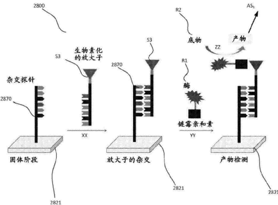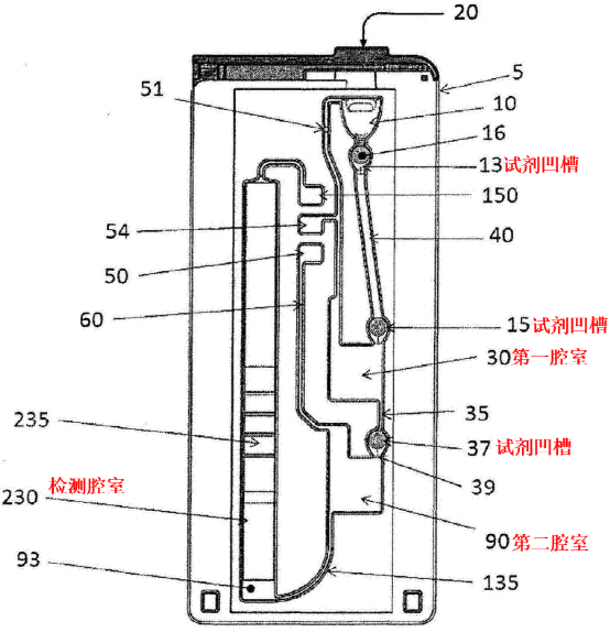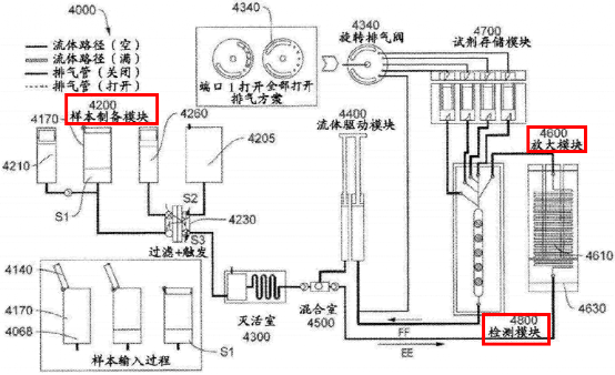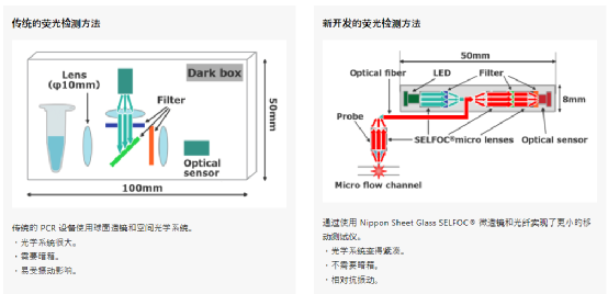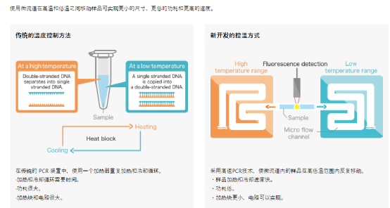 Visby Medical Inc成立于2012年,其开发的无仪器、一次性PCR试剂,可随时随地按需检测,快速获取结果。该平台开发的新冠检测试剂获得FDAEUA,授权于实验室检测使用(非居家自检),其检测性传播疾病的试剂也已获得了FDA许可和CLIA豁免,用于检测沙眼衣原体、淋病奈瑟菌和阴道毛滴虫Visby Medical产品是一款一次性使用的一体化检测卡,操作过程相对简单,大致包含以下步骤:③关闭样本孔盖,并依次按下检测卡的1、2、3号按钮;Visby Medical检测卡的工作流程如下图所示,总体上与核酸分子检测流程无异,同样包含样本处理→核酸扩增→产物检测,对应检测卡中的样本制备模块、放大模块和检测模块。在使用时,当样本加入检测卡后,需手动依次按下按钮1→2→3,此时便启动了样本的输入处理步骤,使得样品通过过滤器被截留捕获,并依次经过洗涤和洗脱步骤,从而获得目标样品,再将其送入灭活室中。灭活室中包含加热器,可使酶失活或裂解释放核酸。裂解释放的样品再被输送至混合室中,与扩增试剂原料混合,并被驱动进入放大模块,执行PCR程序。对于RNA样品,在PCR之前可接入RT模块(图中未画出),以便RNA逆转录成cDNA。扩增后的产物再进入检测模块,与试剂反应,显示结果。其中,在核酸扩增过程中,该检测卡使用了连续流PCR(continuous-flow PCR)。从其放大模块可以看到蜿蜒回旋的形状,对应回路中形成的不同温度带,如图中弯曲部分为低温退火/延伸区,中间部分为高温变性区。PCR反应溶液在流动的过程中,先经过高温预变性区域,再进入循环扩增区域;在循环扩增区域,往复流经变性-退火/延伸区,使得核酸在不同温度区域中实现扩增。当流经整个扩增区域后,则完成了40个循环的扩增过程。其检测方法采用核酸杂交捕获和酶催化显色反应。带有生物素标记的引物,与靶标核酸结合扩增后,使得扩增产物带上生物素标记;该产物进入检测模块后,可与包被在检测区域的互补探针杂交,从而被固定;最后标记有链霉亲和素的酶(如辣根过氧化物酶)与生物素结合,从而形成固相载体-捕获探针-扩增产物-酶复合物;而酶则可催化底物显色,实现结果判读。该产品为一体化的一次性检测卡,无需额外配备PCR仪器,可随时随地按需进行测试,用完即弃。Mesa Biotech成立于2009年,2021年被赛默飞收购,其研发的流感A/B型和呼吸道合胞病毒(RSV)已获得美国FDA的510(K)许可和CLIA豁免,新冠检测试剂也获得FDA EUA(非居家自检)。Mesa Biotech检测卡盒需配合其检测基座使用,检测卡为一次性使用,其使用方法大致如下:④撕开检测卡加样孔上的铝箔膜,并用滴管吸取样本加入检测卡中;⑥30分钟后完成检测,取出检测卡,观察检测卡的结果窗口,判读结果。Mesa Biotech检测卡的靶标微流控部件包含样品输入、裂解、逆转录、扩增和检测五个腔室。样本通过样品输入腔室进入裂解腔室后,在化学试剂或加热条件下裂解释放核酸,再分别通过逆转录和PCR扩增。其中扩增反应为不对称PCR,可产生单链扩增产物,以便后续的核酸杂交检测。扩增后的产物在进入检测腔室后,与检测试剂混合,并进行侧向层析,最后结果可在检测条带中显示。检测卡预装的试剂储存在试剂凹槽位置,可为液体或冻干试剂。当样品由上一个腔室流经下一个腔室时,先通过试剂凹槽与试剂混合,再执行后续的反应过程,如试剂凹槽15预装逆转录原料,则可在第一腔室进行逆转录反应。Mesa Biotech检测卡采用PCR+免疫层析相结合的方法进行检测,扩增后的核酸产物进入检测腔室时,可与检测颗粒混合使得待检测靶标核酸带上标记,且在检测条带层析过程中,可被检测探针捕获,从而在检测区域显示结果。另外,单个检测条带上可使用多个捕获探针,从而实现多个扩增子的多重检测。同时,检测卡也可设计为并行的多腔室,以实现反应的多重检测。基座可重复使用,相当于一台小型仪器;检测卡为一次性使用耗材,样本配合其专用采样管加入检测卡后,进行简单的热裂解处理。3.Nippon Sheet Glass Co., Ltd.日本板硝子株式会社(Nippon Sheet Glass Co., Ltd.)是一家全球知名的玻璃制造商,结合其创新技术开发了一款紧凑、快速、轻便的移动实时PCR装置PicoGene,该设备可以在现场快速识别各种类型的基因,因此有望用于工厂食品卫生、环境污染调查和生物勘探等广泛领域。日本板硝子株式会社(Nippon Sheet Glass, NSG)的Mobile Real-Time PCR device(PicoGene™ PCR1100E)操作比较简便,总共只需三步:③按下“开始”按钮启动测试,根据项目不同,可快至10分钟获得结果,以实时荧光扩增曲线的形式展示。该产品目前仅用于科研使用,从其公布的信息上看,对样本处理过程的描述较少,可能是直接加提取纯化后的核酸,或是对样本的处理较为简单,如免提取、加热裂解等简单处理。其核心技术是基于NSG技术储备开发的微流控芯片和荧光检测系统。其中在PCR循环扩增时,通过在左右两端分别设置高温区和低温区,使得样品通过微流道在两个温度区域来回切换流动,实现PCR的循环扩增程序,同时在样品流动过程中采集荧光信号,形成实时荧光检测信号,以对检测结果进行判读。如同手机式的PCR仪,内置电池,可自由移动,检测结果为实时荧光PCR扩增曲线。北京中科生仪科技有限公司成立于2009年,公司侧重于便携式核酸分子检测设备、实用化POCT设备、基因测序技术及装备,以及相应的配套试剂产品等原始创新研发和产业化工作,目前处于研发阶段的