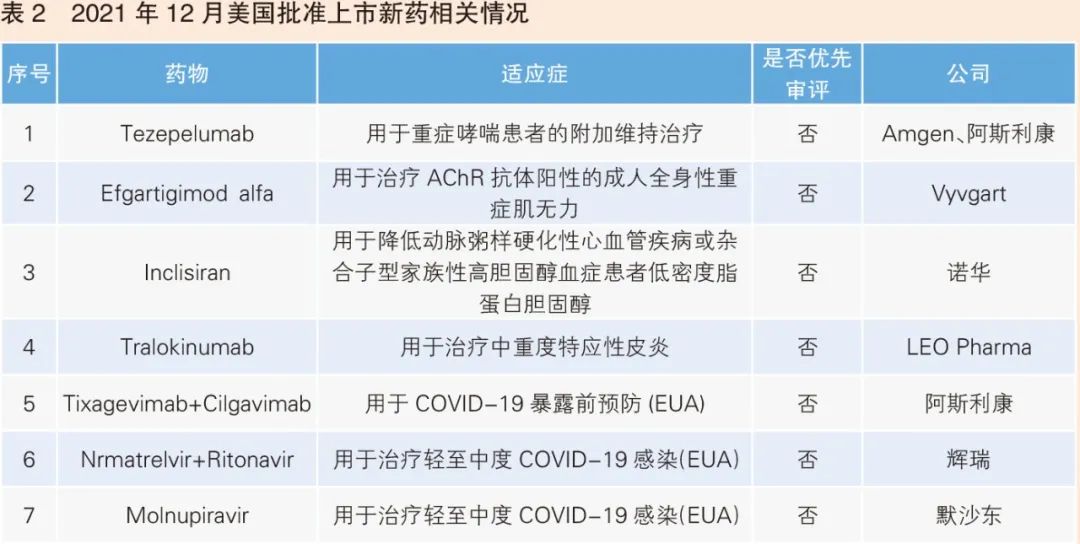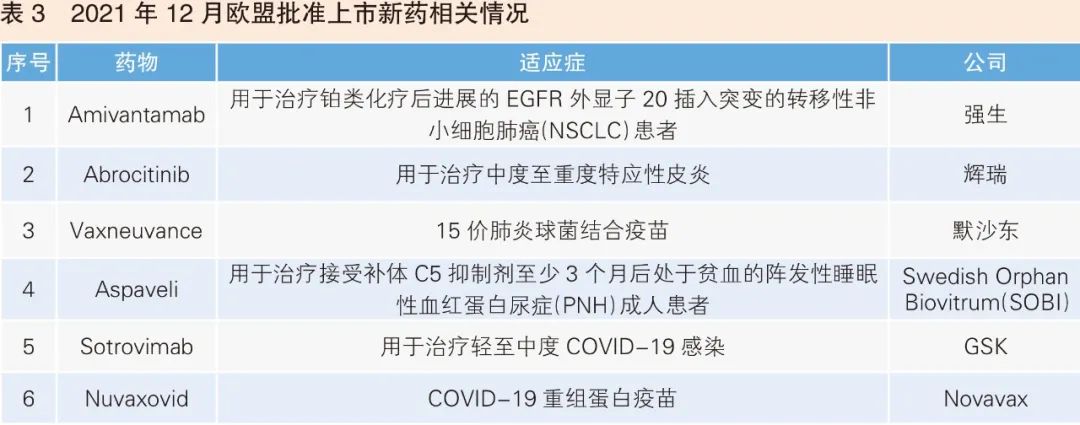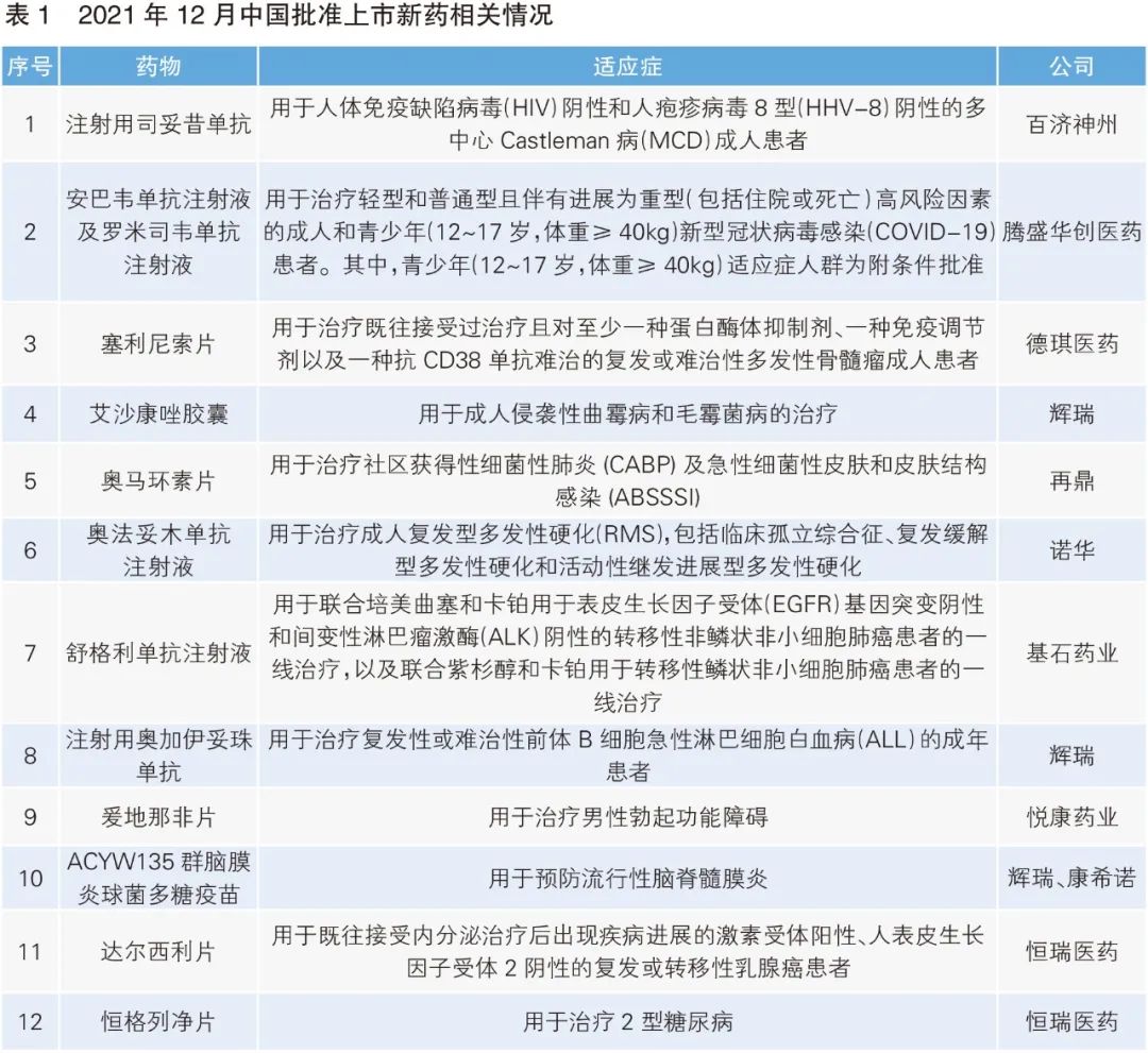 2021年12月,中美欧共批准上市25款新药,较上月增加1倍有余。该月批准上市的新药中,三地均有应对新冠肺炎疫情的疫苗或治疗药物获得紧急批准。 2021年12月,我国批准了12款新药上市,其中5款为自主研发,2款为我国药企引进开发(详见表1)。 2018年,司妥昔单抗因为罕见病用药而被纳入《第一批临床急需境外新药》名单。2020年1月,百济神州与EUSA Pharma达成合作,获得包括司妥昔单抗在内的两款药物大中华地区开发和商业化权利。2021年12月,百济神州的注射用司妥昔单抗通过优先审评审批程序在我国获批上市,用于人体免疫缺陷病毒(HIV)阴性和人疱疹病毒8型(HHV-8)阴性的多中心Castleman病(MCD)成人患者。 国家药监局应急批准腾盛华创医药的新冠病毒中和抗体联合治疗药物安巴韦单抗注射液(BRII-196)及罗米司韦单抗注射液(BRII-198)注册申请。这是我国首家获批的自主知识产权新冠病毒中和抗体联合治疗药物。 德琪医药引进的多发性骨髓瘤治疗药物塞利尼索片,是口服核输出蛋白1(XPO1)抑制剂。塞利尼索方案在国内获批,是基于在中国人群中进行的MARCH研究。研究结果显示,该药对复发难治多发性骨髓瘤受试者、既往接受过达雷妥尤单抗治疗患者,以及既往接受过CAR-T治疗的受试者均具有一定的客观缓解率。 基石药业舒格利单抗注射液为我国批准的第4款、国产第2款PD-L1抗体药物。该药品适用于联合培美曲塞和卡铂用于表皮生长因子受体(EGFR)基因突变阴性和间变性淋巴瘤激酶(ALK)阴性的转移性非鳞状非小细胞肺癌患者的一线治疗,以及联合紫杉醇和卡铂用于转移性鳞状非小细胞肺癌患者的一线治疗。其获批基于一项Ⅲ期临床研究(CS1001-302,LBA-4 GEMSTONE-302)中期分析结果,该项研究创新性地把鳞状和非鳞状非小细胞肺癌放在同一项研究中,该药联合化疗在鳞癌和非鳞癌患者中均有获益。 当月,恒瑞医药有两款新药获批。其中,恒格列净片是首个在国内获批上市的国产钠-葡萄糖协同转运蛋白2(SGLT2)抑制剂,适用于改善成人2型糖尿病患者的血糖控制;达尔西利片是一种口服、高效、选择性小分子周期蛋白依赖性激酶4和6(CDK4和CDK6)抑制剂,能够将细胞周期阻滞于G1期,从而起到抑制肿瘤细胞增殖的作用,适用于既往接受内分泌治疗后出现疾病进展的激素受体阳性、人表皮生长因子受体2阴性的复发或转移性乳腺癌患者。 2021年12月,美国批准上市7款新药,其中3款为紧急使用授权(EUA)用于COVID-19治疗的药物(详见表2)。根据Phar madigger数据库,除Incl isir an和Tralokinumab(曲罗芦单抗)在欧盟首先获批外,其余新药均为全球首次批准。 Tezepelumab由阿斯利康和安进联合开发,是全球首款针对靶向胸腺间质淋巴细胞生成素(TSLP)的抗体药物,通过阻断TSLP阻止免疫细胞释放促炎细胞因子,从而预防哮喘发作和改善哮喘控制。2018年9月,美国食品药品管理局(FDA)授予Tezepelumab治疗无嗜酸性粒细胞表型严重哮喘的突破性药物资格。该药此次获批,基于两个名为PATHWAY和NAVIGATOR的Ⅲ期临床试验的疗效和安全性数据。数据显示,与安慰剂组相比,接受Tezepelumab治疗的患者哮喘恶化的年化率显著降低,需要急诊和/或住院治疗的病情恶化也较少。 Efgartigimod是新生儿Fc受体(FcRn)抗体药物,可与FcRn结合并降低循环中的IgG抗体,用于治疗乙酰胆碱受体(AChR)抗体阳性的成人全身型重症肌无力(gMG)。乙酰胆碱受体自身抗体在神经肌肉接头处的作用是gMG的关键驱动因素。AChR抗体阳性的成人gMG占gMG总体人群的85%。2021年1月,再鼎医药宣布与Argenx达成合作,以7500万美元预付款加1亿美元里程碑金额,从Argenx获得Ef gar tigimod的大中华区的独家开发和商业化权利。当前,再鼎医药已在我国开展该药Ⅰ期临床试验及治疗原发免疫性血小板减少症(ITP)的Ⅲ期临床试验。 “Tixagevimab+Cilgavimab”是两种长效抗体的组合。这两种抗体最早由范德比尔特大学医学中心发现,均来源于康复患者的B细胞,可以结合SARS-CoV-2刺突蛋白的不同位点。该组合是FDA批准的首个用于COVI D-19暴露前预防的抗体疗法。 Molnupiravir是第一个被批准用于治疗COVID-19的口服抗病毒药物。该项EUA基于Ⅲ期临床MOVe-OUT研究的积极中期分析结果。 另一个治疗COVI D-19的口服抗病毒药物是“Nrmatrelvir+Ritonavir”复方制剂,根据EPIC-HR研究,该药可降低住院或死亡风险。 2021年12月,欧盟批准了6款新药上市,但都不是全球首次批准的新药,与新冠肺炎防治相关的共2款(详见表3)。 值得一提的是,此次获批的新药Abrocitinib(阿布昔替尼),曾于2020年获英国药品和健康产品管理局授予的“潜力创新药(PIM)”称号。该药是口服Janus激酶1(JAK1)抑制剂,此次获批是基于5项Ⅲ期临床试验和一项纳入超过3100例患者的长期扩展临床研究的结果。 |