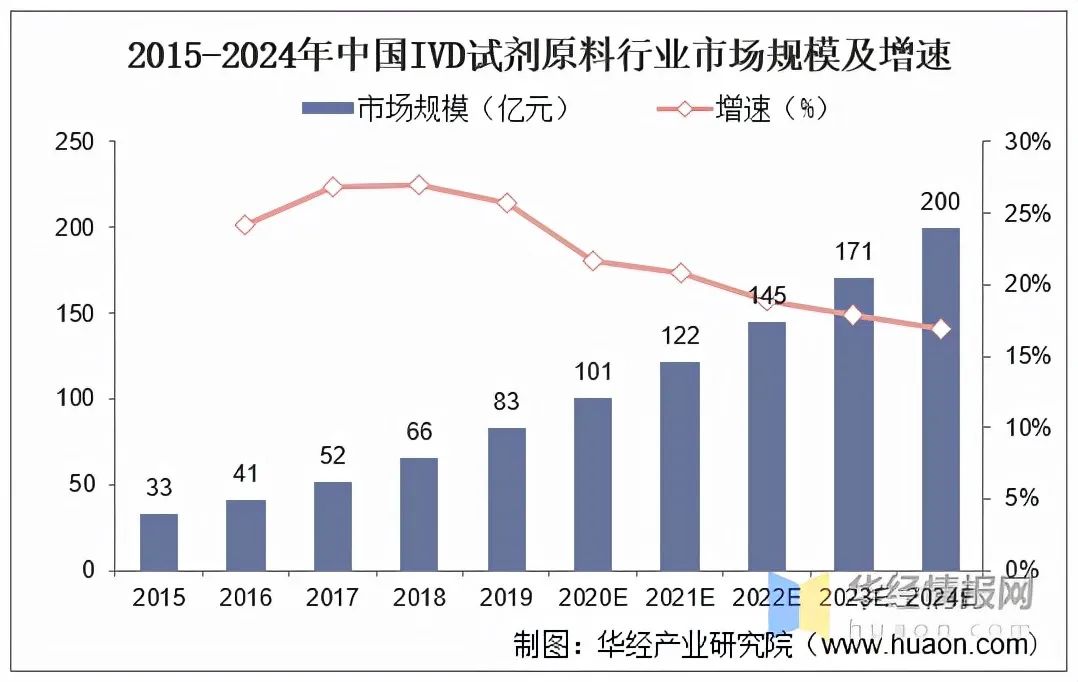 资料来源:公开资料整理 三、IVD试剂原料行业发展现状 IVD行业快速发展带动上游原料市场持续扩容。据统计,我国IVD行业发展迅速,上游原料需求也持续扩大,我国IVD原料市场规模从2015年的33亿元增长至2019年的82亿元,CAGR为26%,预计到2024年将达到200亿元。考虑到后疫情时代IVD检测需求提升、国内核酸检测实验室加速建设等因素对IVD行业扩容的正向催化作用,市场趋势有望加速。2015-2024年中国IVD试剂原料行业市场规模及增速