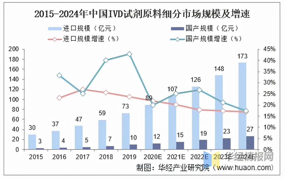 资料来源:公开资料整理 从原料进口和国产市场规模来看,国内约90%的IVD原料市场仍由进口主导,国产发展速度快、替代空间大。据统计,2019年我国IVD原料市场中进口产品市场份额为88%,国产份额仍然较小,但2015-2019年年复合增速为30.6%,高于进口产品的25.3%。随着国内企业技术水平的不断提升、对生物科技产业供应链本地化重视程度的不断加强,以及疫情驱动下游IVD厂商对供应链安全的重视程度提升,预计国产IVD试剂原料市场规模将以23.3%的年复合增速增长至2024年的27亿元,逐步实现进口替代。2015-2024年中国IVD试剂原料细分市场规模及增速