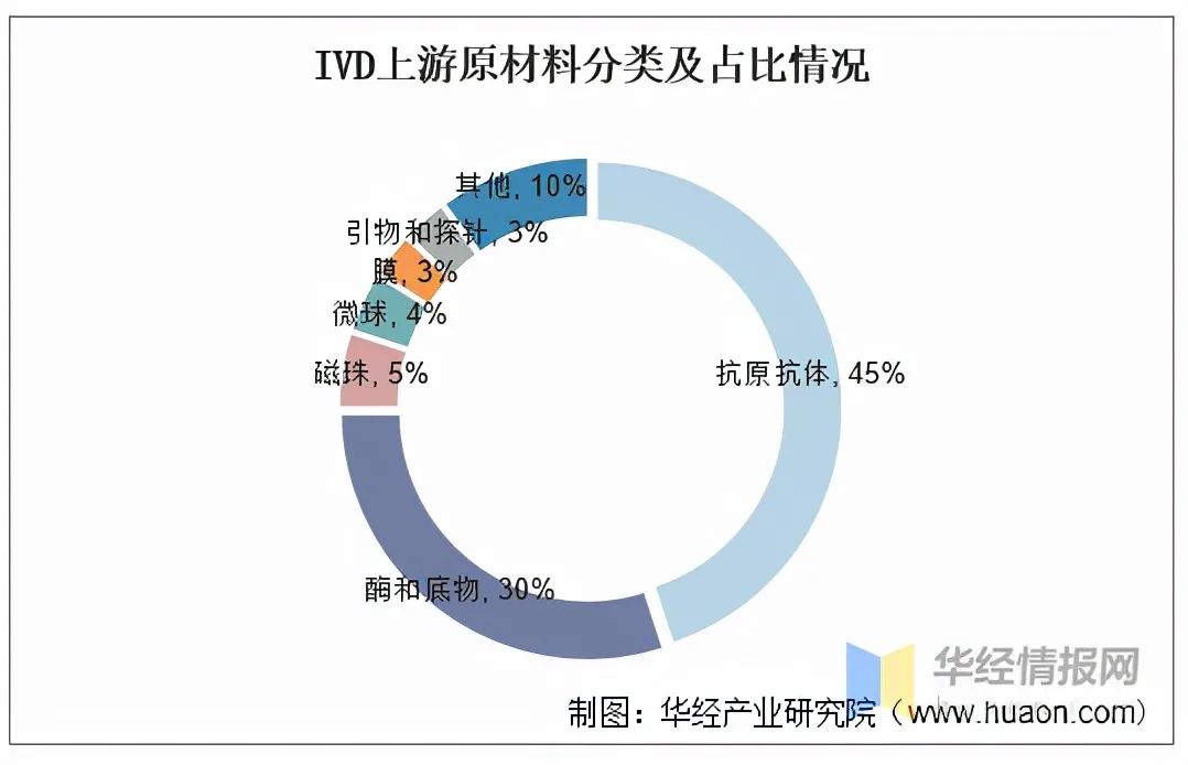 资料来源:公开资料整理 从IVD试剂原材料分类及占比情况来看,抗原抗体、酶和底物占比最多,分别占比45%、30%,其余原材料占比情况为:磁珠占比5%、微球占比4%、膜占比3%、引物和探针占比3%、其他占比10%。IVD上游原材料分类及占比情况