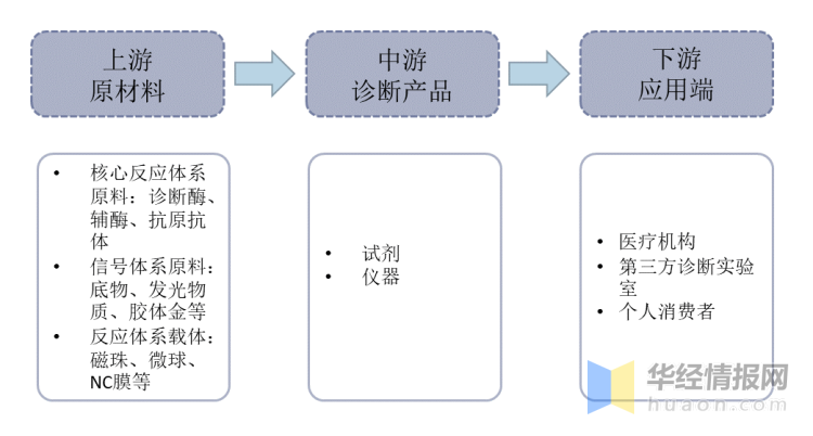 资料来源:公开资料整理 二、IVD试剂行业产业链 IVD试剂行业产业链分为上游原材料、中游诊断产品和下游应用端,上游原材料包括三种原料:核心反应体系原料、信号体系原料和反应体系载体,其中核心反应体系原料我国约90%靠进口,国产规模相对较小。中游诊断产品主要指体外检测诊断使用到的试剂和仪器。下游应用端包括医疗机构、第三方诊断实验室以及个人消费者。IVD试剂行业产业链