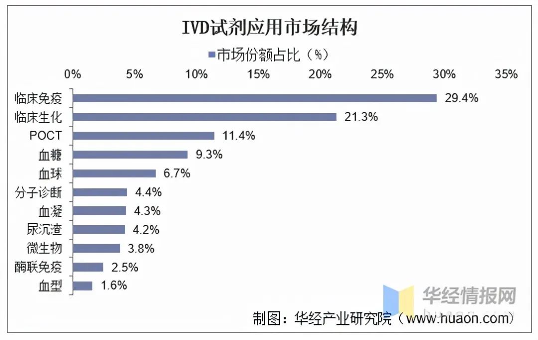 一、IVD试剂原料综述 生物活性原材料是IVD试剂研发和生产的重要原材料,检验产品按照内容主要分为生化、免疫、分子、血球等产品。在试剂配方中会广泛使用生物活性原材料,包括抗原、抗体、蛋白酶等蛋白类的活性物质,还有一些分子类的核酸片段原材料,还有试剂盒、纳米磁珠、化学缓冲剂等产品及耗材。IVD中的生物试剂是用于病理检测的核心物质,以抗原抗体为主,种类繁多,主要应用平台有有放射免疫分析、酶联免疫分析、化学发光免疫分析、胶体金侧向层析、荧光免疫侧向层析、免疫比浊等。 IVD试剂应用市场结构