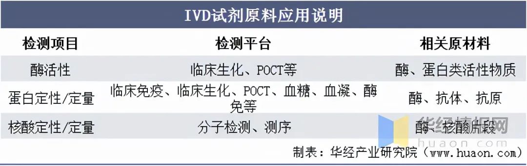 资料来源:公开资料整理 原材料质量的稳定性和可靠性关系到产品的品质,而产品的品质与检验结果的准确性相关,从而影响临床医生的判断以及后续治疗方案,因此原材料牵一发而动全身,是整个诊疗链条上的源头,至关重要。IVD试剂原料应用说明