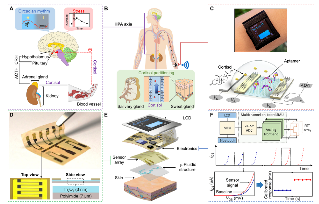 可穿戴监测技术能够通过提供个性化、可操作的反馈改变身体和认知表现,促使人们采用更健康的生活方式。可穿戴传感器可检测和量化可回收生物流体中的生物标记物,提供人类动态生理和心理状态的特定信息。人体传感系统已被用于测量汗液中的生理信息指标,包括pH值、电解质、代谢物或营养水平。 然而,许多低浓度、潜在信息丰富的生物标记物无法通过可穿戴传感系统获取。因此,可穿戴传感器的潜在用途仍然局限于少数狭窄应用。皮质醇——一种关键的应激生物标志物,在低纳摩尔浓度下存在于汗液中。以前的可穿戴传感系统仅限于监测微摩尔-毫摩尔范围内的分析物。此外,现有的可穿戴系统既不具备捕获生物标志物生理相关变化所需的分辨率,也不具备动态能力进行准确、无缝地进行测量。 近日,来自于UCLA以及哥伦比亚大学的研究团队在Science Advances发表了一篇题为“Wearable aptamer-field-effect transistor sensing system for noninvasive cortisol monitoring”文章。研究团队开发了一种灵活的场效应晶体管(FET)生物传感器阵列,该阵列利用了以前未报道的皮质醇适体偶联到In 2 O 3 的纳米薄膜FET上。研究团队通过跟踪Trier社会压力测试参与者的唾液皮质醇水平确认了皮质醇作为压力生物标志物的生理相关性,并建立日间唾液和汗液样本中皮质醇之间的相关性。这些相关性推动了基于适体场效应晶体管阵列的智能手表的开发和体内验证,该智能手表配备了定制、多通道、自参考和自主源测量单元,可实现无缝、实时的皮质醇汗液传感。 图片来源:Science Advances 主要内容 01 无创皮质醇生物标记物监测概述 使用可穿戴适体FET传感系统进行无创皮质醇生物标记物监测。图片来源:Science Advances 皮质醇是一种低浓度的生物标志物,它是应激反应性下丘脑-垂体-肾上腺轴的关键组成部分。皮质醇失调发生在重度抑郁症、焦虑症、创伤后应激障碍、肥胖、库欣病和艾迪生氏病。有研究表明个体皮质醇水平与神经行为发展轨迹和个人行为有着紧密的联系。 临床研究表明,唾液和血液中游离皮质醇水平之间存在显著相关性,汗液中的皮质醇也存在类似的相关性。为了以可穿戴的形式监测低浓度、小分子生物标记物,如皮质醇,研究团队设计、开发并研究了基于场效应晶体管(FET)阵列的传感系统。该阵列利用了一种新发现的皮质醇适体(作为生物认知元件)耦合到FET的纳米通道中(作为信号转导平台)。基板被嵌入一个薄膜微流控装置中,以形成一个可粘附皮肤的生物流体采样、布线和分析模块。通过部署基于aptamer FET阵列的smartwatch,实现了无缝实时的生物标记物数据采集。不仅如此,适体场效应晶体管传感器是通用的和模块化的。它们可以直接以可穿戴和移动的形式适应其他生理生物标志物,包括汗液(或其他体液)中低浓度的目标。 02 皮质醇适体FET传感器的研制与验证 研究团队成功找到了一个以前未知的DNA适配子序列,该序列可直接识别人类应激激素皮质醇。 TSST,一种金标准实验室程序,用于在人类参与者中可靠地诱导应激,以确定应激诱导的唾液皮质醇升高。唾液皮质醇水平通过标准实验室分析,即液相色谱串联质谱(LC-MS/MS)或酶联免疫吸附试验(ELISA)进行定量。唾液皮质醇浓度在应激15分钟后达到峰值然后在75分钟内下降。研究团队使用皮质醇适体FET装置分析了一名TSST代表参与者的唾液样本。FET传感器测量显示,应激15分钟后,皮质醇出现峰值,随后应激90分钟后,皮质醇恢复到基线水平,这与标准实验室分析显示的趋势一致。唾液和汗液皮质醇水平之间的相关性为0.73,支持唾液和汗液皮质醇水平之间的相关性。 皮质醇适体FET传感器的生物学适用性 图片来源:Science Advances 03 无线可穿戴适体FET阵列的smartwatch, 用于实时人体汗液分析 研究团队整合了一个微流控模块和一个由110毫安时锂聚合物电池供电的液晶显示器(LCD),以生产“智能手表”。通过移动电话应用程序,smartwatch可以在设定的时间获取实时测量值(即皮质醇、pH值和温度)时间间隔。smartwatch的实时录制结果显示,皮质醇通道检测到夜间出汗皮质醇水平下降,与典型的昼夜节律和我们的离体相关研究观察结果一致。 基于适体FET阵列的smartwatch,用于实时人体汗液分析 图片来源:Science Advances 总结 研究团队开发了一种灵活的场效应晶体管(FET)生物传感器阵列,并推动了基于适体场效应晶体管阵列的智能手表的开发和体内验证,该智能手表配备了定制、多通道、自参考和自主源测量单元,可实现无缝、实时的皮质醇汗液传感。 从临床角度来看,鉴于汗液是一种相对未充分开发的生物流体,制定标准方案(例如,基于汗液的TSST)将有利于形成以汗液为基础的生物标记物研究为中心的大规模、动态和纵向研究的基础。基于适体FET阵列的smartwatch产生的数据可以与其他用户特定的静态和动态信息相关联,以提供监测疾病状态的客观标准(例如,激素失衡)医嘱,如库欣病和艾迪生病,协助诊断抑郁症),并向用户提供个性化反馈,以及时告知干预措施。 |