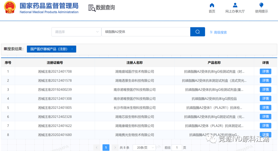 此外,自身免疫系列指标成为近两年的热门项目,多家化学发光厂商、流式荧光厂商,甚至胶乳比浊厂商,争相推出自身免疫指标定量检测试剂。由于该系列项目数量众多,想要做全整套原料殊非易事。不少试剂厂家选择自行开发原料,从源头上解决问题。以膜性肾病指标抗磷脂酶A2受体抗体为例,目前获证公司已达7家,相信未来还将快速增加。