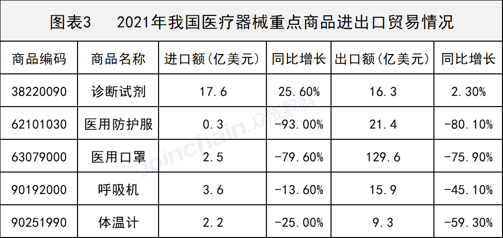 另外,2021年诊断试剂(含新冠病毒检测试剂)的进口额为17.6亿美元,同比增长25.6%;体温计出口额为9.9亿美元,同步下降59.3%。