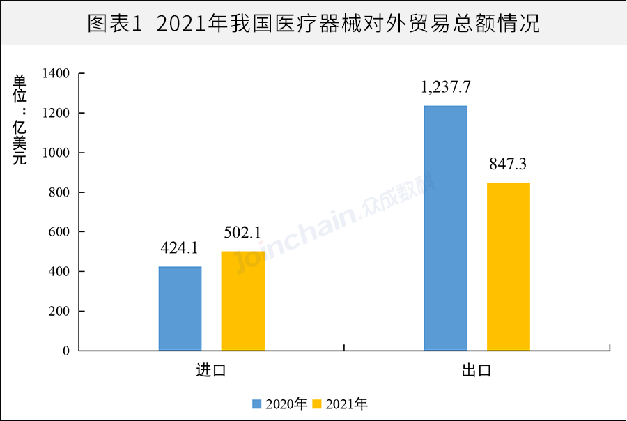 2021年我国医疗器械对外贸易总额达1349.4亿美元,同比下降18.8%。其中,进口额502.1亿美元,同比增长18.4%;出口额847.3亿美元,降幅31.5%。