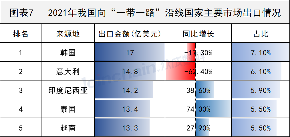 2021年我国向“一带一路”沿线国家出口医疗器械商品总额达241.1亿美元,同比下降24.4%。主要出口国家为韩国、意大利、印度尼西亚、泰国、越南等地。韩国是出口额最高的国家,为17亿美元,同比下降17.3%。