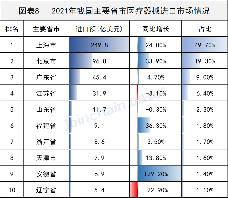 从全国进口海关口岸的贸易数据来看,2021年上海市、北京市、广东省医疗器械进口规模位列全国前三。其中上海市进口额达249.8亿美元,同比增长为24.0%,占比达49.7%,北京市和广东省紧随其后,进口金额和占比分别为96.8和45.4亿美元,19.3%和9.0%。