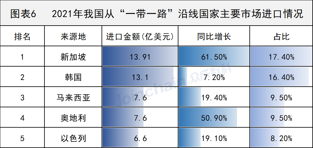 在进口市场方面,美国、德国、日本等国家为主要来源地。其中,美国进口额达到120.9亿美元,占比24.1%,同比增长19.5%。同比增长最大的是新加坡,达到61.5%,进口额为14.0亿美元,占比为2.8%。