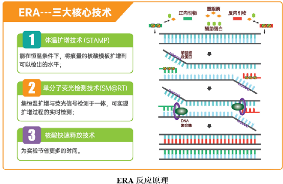 在全球新冠疫情期间,时有媒体报道家庭自检神器的各种优势,特别是关于核酸分子检测的家庭自检产品,虽不是每一个都很惊艳,但总能引起一阵轰动。这些产品在媒体的宣扬下,总是显露出“以快制胜”的特点,从雅培的ID NOWTM“最快5分钟确定阳性结果,13分钟确定阴性结果”,到先达的基因镜“技术突破,10分钟完成检测”。它们的“快”到底体现在哪?难道也就只有“快”这一特点吗? 01 雅培ID NOWTM 1.技术原理 ID NOWTM是雅培通过收购Alere后获得的检测平台,从其公布的甲/乙型流感病毒检测方法上看,该平台采用的技术为切口酶扩增反应(Nicking Enzyme Amplification Reaction, NEAR),是一种基于切刻内切酶切割特性的恒温扩增方法,详细技术原理如下: (1)设计一对含有酶切位点的引物,其5’端到3’端包含稳定区域、切刻内切酶结合/切割区域、靶标配对区域。反应过程中,引物的靶标配对区域与目标序列结合,并在DNA聚合酶作用下延伸扩增,从而引入切刻内切酶识别序列(图A中的1a~3a)。最后在上下游引物参与引发的合成过程中,形成两端含有切刻内切酶识别序列的双链DNA(图A中的4a~6a)。 (2)反应体系中添加有切刻内切酶(Nicking Enzyme),该酶与限制性内切酶不同,其识别特定序列后,并不直接切断DNA双链,而是在其中的一条链上产生缺口,并暴露出游离的3’端,从而可作为引物,在DNA聚合酶作用下启动扩增,由切口处继续合成新链。同时,体系中的DNA聚合酶具有链置换功能,可置换出下游的DNA链(图B中的1b~2b)。 (3)被置换出的DNA链可作为模板,其3’端序列与引物的靶标配对区域结合,分别由5’端向3’端延伸,形成一端含有切刻内切酶识别位点的双链DNA(图B中的3b~4b)。 (4)一端含有切刻内切酶识别位点的双链DNA又可被切刻内切酶识别并切割,再次启动扩增并置换出下游DNA链,该单链DNA与另一条引物的靶标配对区域结合并延伸,同样形成另一端含有切刻内切酶识别位点的双链DNA,由此形成循环扩增过程,产生大量产物。 (5)反应体系中加入荧光标记的探针,可与扩增后的靶标序列结合并产生荧光信号。在一定时间内,ID NOWTM会采集荧光信号,当信号到达设定阈值时则判定为阳性。 另外,雅培通过收购也获得了RPA专利,拥有这两项恒温扩增技术的专利,该平台或许可根据检测项目选择使用其中一种技术。关于RPA的技术原理,可查看充满想象力的恒温扩增技术:RPA、RCA、SDA、HDA,也可参考下文的ERA技术。 2.操作过程 ID NOWTM的仪器在打开前盖后,里面有两个反应腔室,一个用于样本前处理(蓝色部分),另一个用于扩增检测(橙色部分),分别对应着检测试剂盒的两个组件:样本收集器(SampleReceiver)和检测基座(Test Base)。单人份检测试剂主要包含三个组件:其中样本收集器含有样本处理液,用于释放样本核酸;检测基座包含反应管,装有冻干后的扩增检测试剂;还有一个转移管(Transfer Cartridge),用于处理后的样品转移,带有吸液和排液功能。具体检测过程如下: (1)打开仪器盖子后,在扩增检测位置放上检测基座,仪器可扫描信息确定检测项目;再在样本前处理位置放上样本收集器,预热约3分钟。 (2)预热完成后,撕开样本收集器上的密封膜,用移液枪吸取200μL液体样本加入样本收集器中,或直接将采集后的拭子置于样本处理液中来回搅拌,释放核酸,该过程操作时间大概为10秒。 (3)将转移管扣于样本收集器上,自动吸取样本,再手工移动至检测基座上,扣上转移管,样品释放至检测管中,盖上盖子,仪器开始检测,并自动报告结果。 (4)反应结束后,将转移管-检测基座-样本收集器三者扣紧后丢弃。 从操作过程上看,人工操作步骤比较简单,总体检测时间也较短,但等待时间碎片化、操作步骤需人为衔接等过程,使得操作简便性略显不足。 02 先达的GENEYE® 1. 技术原理 GENEYE®(基因镜)是苏州先达基因科技有限公司最近公开的一款微型核酸荧光检测仪,搭配其自主开发的新一代核酸检测技术(New ERA),可实现全程10分钟的现场化检测。其扩增方法酶促重组扩增技术(Enzymatic Recombinase Amplification, ERA)是一种类似RPA的恒温扩增技术,详细反应原理如下: (1)反应体系中的特异性上下游引物分别与重组酶等蛋白结合形成复合体后,将扫描双链DNA模板,搜索与引物同源的靶标序列。 (2)复合体识别并定位至同源靶标序列后,重组酶解开双链结构,并使引物置换出模板的互补链,同时单链结合蛋白结合至被置换出的单链DNA上,稳定单链结构。 (3)在ATP水解供能下,重组酶解离暴露出引物3’端,DNA聚合酶随即结合至引物上,启动DNA扩增。 (4)DNA聚合酶延伸过程中,同步解开DNA双螺旋结构,合成新的扩增产物。 (5)产物同样可作为模板参与扩增,在重组酶、单链结合蛋白和DNA聚合酶等相互协作下产生大量扩增子。 ERA的最适反应温度为37~42℃,是一种体温扩增技术,对仪器温控系统要求较低。多个酶作用下,促使反应体系在恒温条件下快速扩增,使得痕量核酸模板扩增到可检出水平。先达基因基于ERA技术开发了常规电泳检测、实时荧光检测和试纸条可视化检测等多种快速检测试剂;同时开发了免提取的核酸释放剂,用于样本的快速处理;也基于其单分子荧光检测技术,研发了集恒温扩增与荧光信号检测于一体的荧光恒温扩增仪。可能正是基于这些核心技术,才汇聚成就了一款简单快速的小型化检测设备。 2.操作过程 基因镜非常小巧,重量仅为200g,可通过手机连接后,在手机APP上操作