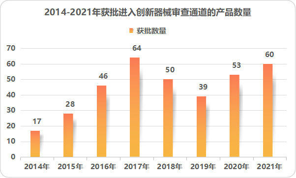 ▲ 数据来源:众成医械 其中2014-2021年分别获批17件、28件、46件、64件、50件、39件、53件、60件。