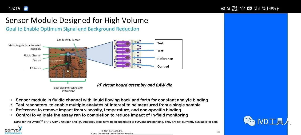 Qorvo Biotechnologies的COVID-19抗原测试在4月份获得了美国FDA的紧急使用授权(EUA)。 Qorvo Omnia平台通过使用高频体声波(BAW)传感器实现快速的新冠抗原测试。BAW传感器技术可实现类似于分子测试的超低检测限1pg/ml。 BAW(体声波),通过压电陶瓷产生声波。BAW是一种微谐振器技术,能够将高精度和超低抖动时钟直接集成到包含其他电路的封装中。 Qorvo Omnia是一款尺寸为10“ x 9” x 5“的小型仪器,试剂盒是一个独立的湿化学测试设备,约15分钟完成测试。 视频展示👇 原理图示