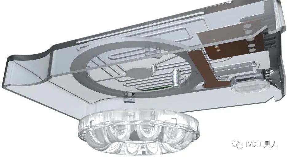 这个试剂卡下面的转盘装载了不同溶液,试剂卡上有Tip头可以插入这个圆盘。 可以看到这个试剂卡转盘上有10个孔,里面可以装载清洗液,或者试剂,清洗过程可以4到8次,极大保证了特异性。 我节选了专家讲芯片和试剂卡的2分钟,有兴趣的可以观看。