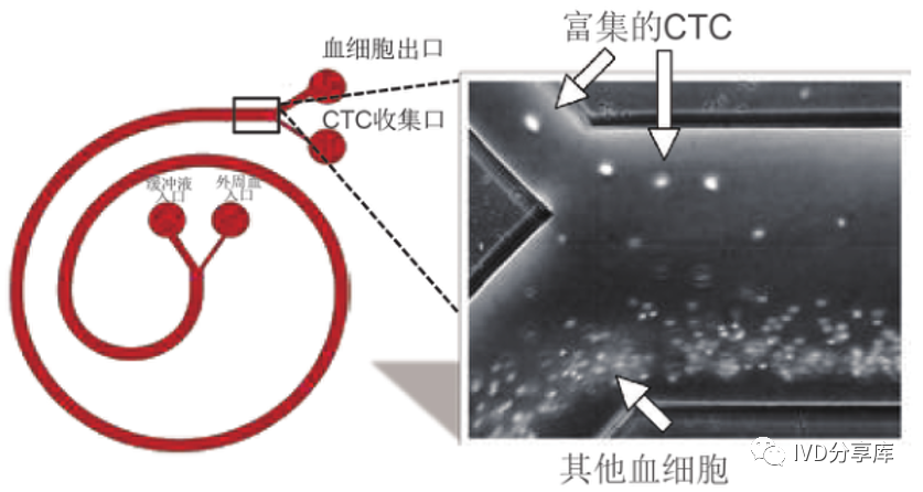 从图中可以看出,迪恩流分选芯片有两个入口(一个进缓冲液;另一个进处理后的外周血);两个出口(一个出循环肿瘤细胞;另一个出血细胞)。