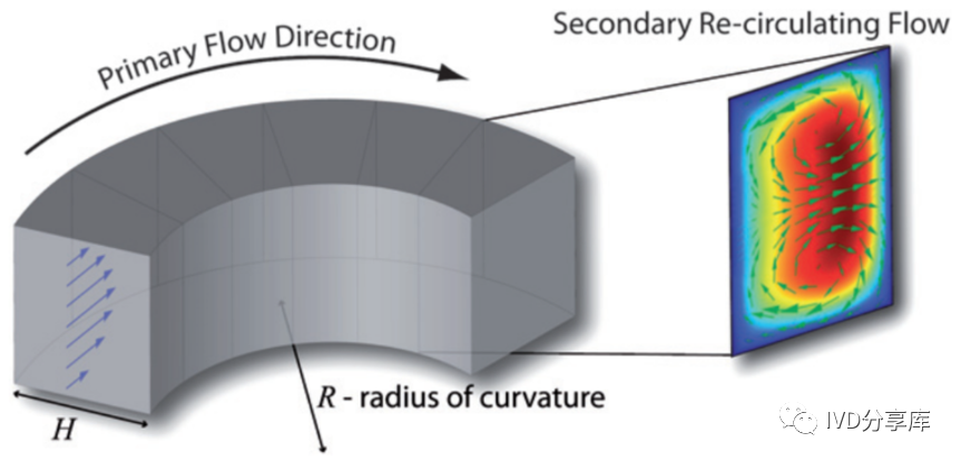 “迪恩流效应”:由于微尺度弯流道内的流体流动表现为抛物线状的poiseuille流,使得流道中心区域的流体流速远高于近壁面区域的流体流速。当流体在弯流道内流动时,径向压力和离心力梯度不平衡使得流道中心区域的流体向流道顶部和底部分别以逆时针和顺时针方向流动,以补偿近壁面附近的低流体流量。最终,弯流道内的流体在流道截面上产生了两个对称旋转的漩涡,该现象即为迪恩流效应。