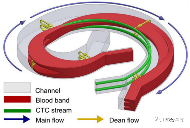 循环肿瘤细胞捕获技术平台的比较 循环肿瘤细胞富集系统ClearCell®FX的核心部件就是CTChip® FR1 biochip,采用了迪恩流分选技术,根据细胞大小、惯性等物理特性,无标记完成循环肿瘤细胞的富集,筛选出完整的活细胞。这里我们把CTChip® FR1 biochip称为迪恩流分选芯片。下面是迪恩流分选芯片分离循环肿瘤细胞的显微观察视频。 迪恩流分选芯片是如何实现循环肿瘤细胞的无损分离呢?在深挖技术之前,先了解下什么是“迪恩流”和“迪恩流效应”。 “迪恩流”又称二次流,由弯流道中心区域与近壁面区域流体流速不匹配而导至的一种惯性效应。