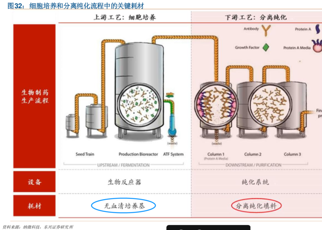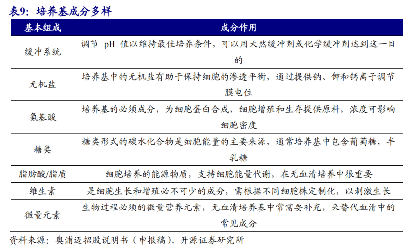 只要是需要用到细胞生产的生物制剂产品,就离不开培养基,它更是决定的目标产品的产量和质量的关键耗材;如生产PD-1为例,培养基的渗透压直接决定了杂交瘤细胞中抗体产生的速率和质量。培养基开发的技术壁垒高、工艺复杂,配方一般包含 70-100 种不同化学成分(包括糖类、氨基酸、维生素、无机盐、微量元素、促进生长的因子等)。