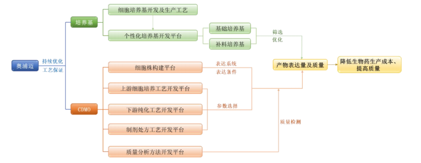 “2021年6月发布的《已上市生物制品药学变更研究技术指导原则(试行)》,培养基属于生物制品生产企业的重要原材料,培养基关键成分的变更(如增加、去除、替换、增多、减少、供应商改变)均根据实际情况纳入变更参考类别,按照《指导原则》的技术要求提供相应说明及更新材料。”基于这个行业特性,奥浦迈也构建了“培养基+CDMO”两大核心业务。