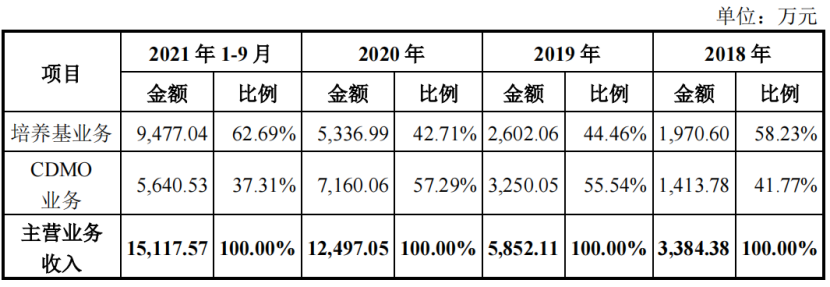 2018-2020年及2021年1-9月,公司培养基产品收入为1970.60万元、2602.06万元、5336.99万元和9477.04万元,2018-2020年复合增长率为64.57%。