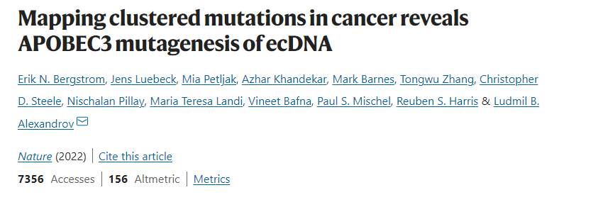 癌症是由基因引起的疾病,癌症基因组中包含着许多不同的体细胞突变,大多数单碱基替换和InDel独立的分散在基因组中。但在某些情况下这些突变会聚集。聚集体细胞基因突变在癌症基因组中不可忽视,目前的研究已经描述出几种类型的成簇突变,包括:双碱基替换(DBS),多碱基替换(MBS),弥散性超突变(omikli)和长链协调事件(kataegis)。 DBS相关研究揭示了可导至这些事件的多种内源性和外源性过程,包括DNA修复失败和暴露于环境诱变剂。MBS尚未得到全面研究,可能是由于它们在癌症基因组中的数量很少。只有少数癌症突变过程与omikli 和kataegic事件相关,其中多数事件与激活诱导的脱氨酶(AID)和APOBEC3脱氨酶家族相关。APOBEC3脱氨酶在先天抗病毒免疫过程中发挥重要作用,APOBEC3对外源性逆转录病毒具有广泛的免疫功能,个别APOBEC3家族成员还可以阻断乙型肝炎病毒(逆转录病毒的远亲)的复制。染色体外DNA(ecDNA)是独立于染色体外的相对较小的染色体颗粒,由DNA和蛋白质组成。研究表明,环状ecDNA以高拷贝数存在,通常包含已知的癌症基因,并且存在于大多数癌症中。由于cDNA的环状性质及其快速复制的特性,类似双链DNA病毒病原体,表明它们可能是APOBEC3作用的底物。近日,美国加州大学圣地亚哥分校的Ludmil B. Alexandrov教授团队在Nature上发表题为“Mapping clustered mutations in cancer reveals APOBEC3 mutagenesis of ecDNA”的研究文章。研究团队分析了来自30种癌症的2500多个全基因组数据,绘制了已知聚集性体细胞突变最全面、最详细的图谱,揭示了ecDNA中APOBEC3的突变特征,这种此前未被发现的突变模式导至了约10%的人类癌症的发展。研究发现,kataegic事件中有76.1%表现出与激活诱导的脱氨酶(AID)和APOBEC3脱氨酶家族相关的突变模式。在31%的ecDNA样本中发现APOBEC3相关的kataegis事件和染色体外DNA(ecDNA)的共同出现,并将这种情况称为kyklonas事件。文章第一作者Erik Bergstrom博士表示:“聚集突变在很大程度上被忽视了,因为它们只占所有突变的很小一部分。但通过深入研究,我们发现它们在人类癌症的病因学中发挥着重要作用。”研究团队分析了来自全基因组泛癌分析(PCAWG)项目的2583个癌症全基因组测序数据,共发现1,686,013个聚集的单碱基替换和21,368个聚集的插入缺失。DBSs、MBSs、omikli和 kataegis分别占所有样本中聚类替换的45.7%、0.7%、37.2%和7.0%。随后,对每一类估计聚集事件进行突变特征分析,识别了12个DBS、5个MBS、17个omikli、9个kataegic和6个聚集indel特征(图1)。研究人员着重分析了kataegic事件,发现所有kataegic事件中有36.2%发生在结构断点10kb范围内,但不在检测到的焦点扩增上(图2a)。kataegic事件中有21.8%发生在检测到的焦点扩增或焦点扩增结构断点的10kb内:9.6% 发生在环状ecDNA上,6.3%发生在线性重排中,3.3%发生在重排事件中,2.6% 发生在与断裂-融合-桥接循环中。42.0%的kataegic事件既不在结构断点的10kb 范围内,也不在检测到的焦点扩增范围内。对kataegic事件和近端的结构变化之间的距离分布进行建模发现(图2b):kataegis在10kb内、大约1 Mb或超过1.5Mb可检测断点。图2. Kataegic事件与大多数形式的结构变异共存。 研究发现,与ecDNA相关的kataegis(即kyklonas)与近端断点的平均距离约为750 kb,只有0.35%的kyklonic事件发生在ecDNA上和断点的10 kb内(图2b)。虽然只有9.6%的kataegic事件发生在ecDNA区域内,但超过30%的ecDNA具有一个或多个相关的kyklonic事件,这些ecDNA区域内的突变以APOBEC3模式为主。(图 2c,d)此外,kyklonic事件中APOBEC3B表现出C>T和C>G突变的富集(下划线表示该核苷酸发生突变),表明APOBEC3B可能在环状DNA中具有重要的诱变作用(图2e)。与没有ecDNA的样品相比,在具有ecDNA的癌症中检测到的APOBEC3B表达量增加(图2f)。图3. ecDNA的复发性APOBEC3超突变。