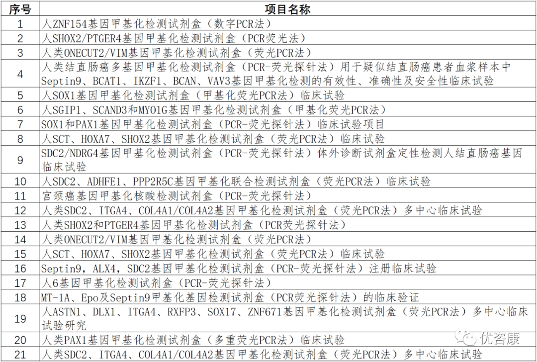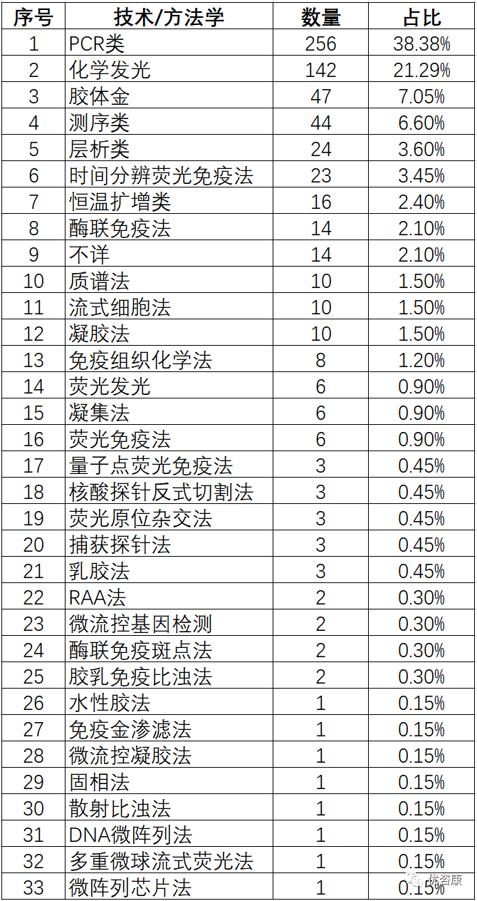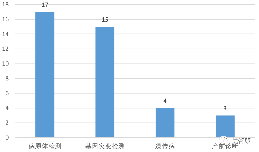 2021年IVD临床试验分析报告-中2021年进行临床试验的IVD项目(该处只指采集审批的IVD项目,不代表2021年所有的IVD临床试验,下同)按检测方法/技术划分为33类(该划分仅为笔者根据经验划分,若有不当之处,欢迎指正交流)。 其中PCR类包含:PCR-荧光探针法,荧光PCR-毛细管电泳法,PCR-SSP法,荧光PCR-熔解曲线法,PCR+导流杂交法,甲基化荧光PCR法,PCR-测序法,PCR-飞行时间质谱法,PCR-反向点杂交法,卡式荧光PCR法,PCR-量子点荧光法,PCR-流式荧光杂交法,XNA分子钳-多重荧光PCR法,荧光RT-PCR法,Gap-PCR法,数字PCR法,多重荧光PCR法和多重熔解曲线。 测序类含:NGS和Sanger测序和靶向测序法。 质谱法含:飞行时间质谱和串联质谱法。 不详定义为:项目名称中未提及方法学或方法学过于简单(根据已有经验判断不出具体方法学且非新方法学的项目)。 数量排名前四位的分别是:PCR类(256)、化学发光(142)、胶体金(47)、测序类(44),这四位占总数的73.31%,具体数据如下: 图1 项目方法学分类 测序技术作为IVD领域的重要技术之一,在2021年共进行了44项临床试验,Sanger测序有6项,采用该技术的产品变少,NGS测序有37项,这几年增速较快,其中采用可逆末端终止测序法的产品最多(占比54.6%)。NGS中病原体检测项目超过了基因突变检测项目(图3),一些项目为首次出现在官方公开数据中:人循环肿瘤DNA、呼吸道病原微生物和组织TMB等,具体数据如下(部分分类规则较为主观,仅供参考): 图2 测序项目方法学分布 图3 NGS技术应用领域分布 图4 测序项目清单 基因甲基化检测是IVD细分的热门赛道, 2021年共计有21项产品,荧光PCR为主要的技术手段(20项),数字PCR有1项,涉及32个基因,其中前三位分别是:SDC2(5项)、SHOX2(4项)、ITGA4(3项)和Septin9(3项),具体数据如下: |