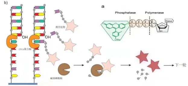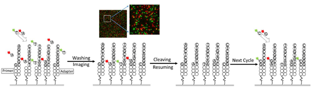截止2022年Q1, 在不同测序平台上NMPA获批的肿瘤Panel,如下图,多集中在非小细胞肺癌、靶药的选择,区别除了文库方法、LoD最低检出限等,还在于测序仪不同。 “ 在MRD 微小残留灶应用上,不同检测Panel,不管采用何种路线,最后的呈现主要差异还在最低VAF检测水平,千分位到万分位不断改进。 关于不同测序仪,能否帮助大量的肿瘤Panel,提供差异化性能的话术呢? 测序聚合反应的差异 目前国内有多款测序仪待NMPA获批上市,如赛纳生物几个月前发布了S100二代测序仪,其特色是所谓 1.荧光发生化学测序和 2.纠错编码测序。第一点体现在荧光基团在磷酸键末端,其随着聚合反应会脱落被检测到,而在测序反应时,合成的碱基类似于天然状态,不会引入”疤痕”, 不会造成空间阻位,所谓Phasing现象。 第二点,是在每个测序循环加入2种dN4P,即2个分子组合,如首先加M组合(包括A和C碱基),续加K组合(包括G和T),完成首轮测序,还要进行第二、第三轮的分子组合测序,最终兼并3次测序链的信息得到序列。那么经过多次测序欲提高精准度,但多次测序带来的试剂消耗和TAT时间也是要评估下。初看上去还好,聚合比为:平均每个Cycle可延长约2个碱基,目前公开的评测数据较少。 碱基读取方式的差异 真迈测序仪据悉已获得临床注册受理,先看型号- 单分子测序GenoCare 1600 其碱基读取方式属于两色荧光信号,首先绿色荧光标记C 和T ,红色标记G 和A。第一轮加入2个dNTP,混合荧光先区分碱基,清洗后进入下一个循环,再加入其他2个dNTP, 由激发光区分碱基。有点类似华大CoolMPS,整个循环下来依然要拍 4张images, 速度不够快,但因为其单分子技术不需要扩增,建库简单时间短,所以整体测序时间可接受。 另外硬件方面,采用了叫total-internal reflection-fluorescence (TIRF)的光学器件,可检测单分子下的微弱信号。2台CMOS照相机可最大化单分子的信噪比。为了加速测序速度,整个Flow cell 被虚拟分为两个区块,多条Lanes。不同区块可同时进行流体化学反应,及拍照成像。 在上述体系下,GenoCare 的 mismatch, insertion 和 deletion 的错误比例分别达到 0.61% ,1.45% 和2.76%,依然有提升空间。 而另一型号GenoLab采用较传统SBS聚合, 与某进口平台对转录组等进行平行检测,对于Q20以上的碱基质量分别为94.86%和 97.5%,两者差距不算大。 华大之前发布的 CoolMPS 使用了没有荧光标记的可逆终止子,它采用特定的抗体来检测可逆终止子,如下图。 标记抗体的显著优势是:一个抗体可以标记多个荧光分子。信号更强的好处是测序的数据质量更高,即使DNA纳米球的拷贝数低,也能得到较亮信号。 荧光读取上,华大的两色读取法不同于别家的2-color成像,(别家如下图,无信号下默认为G碱基)。 而华大CoolMPS的两色荧光,使用两轮标记法,分组读取两个碱基,理论上可更好的分离染料色,相机也可以做到轻配置,在文献中有提及降低碱基错误率。但从荧光抗体结合、洗脱检测,到多轮荧光采集,整体的信号读取时间可能偏长,也成为后续升级的方面。 总体来说,肿瘤各类大、小Panel的差异可以体现在性能上,性能也可反应在测序平台,近些年将会有多个国内测序仪获批,不同测序仪采用不同的聚合反应原理、不同的信号读取方式,希望让各个Panel 变得更有特点。 Reference 1.Fang Chen,Two Color Single Molecule Sequencing on GenoCareTM 1600 Platform to Facilitate Clinical Applications,medrxiv,2020 2.Snezana Drmanac, CoolMPS: Advanced massively parallel sequencing using antibodies specific to each natural nucleobase, bioRxiv, 2020 |
