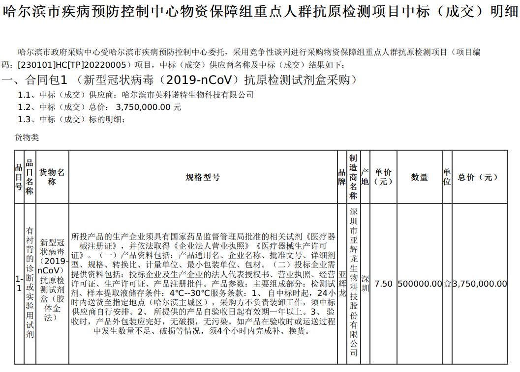 中标公告结果显示:中标单价为7.5,共计50万人份,总价3750000。中标品牌为:深圳亚辉龙;中标供应商为:哈尔滨市英诺特生物科技有限公司。 随后,3月25日,中国政府采购网公布哈尔滨市疾病预防控制中心物资保障组重点人群抗原检测项目结果更正公告(第一次)