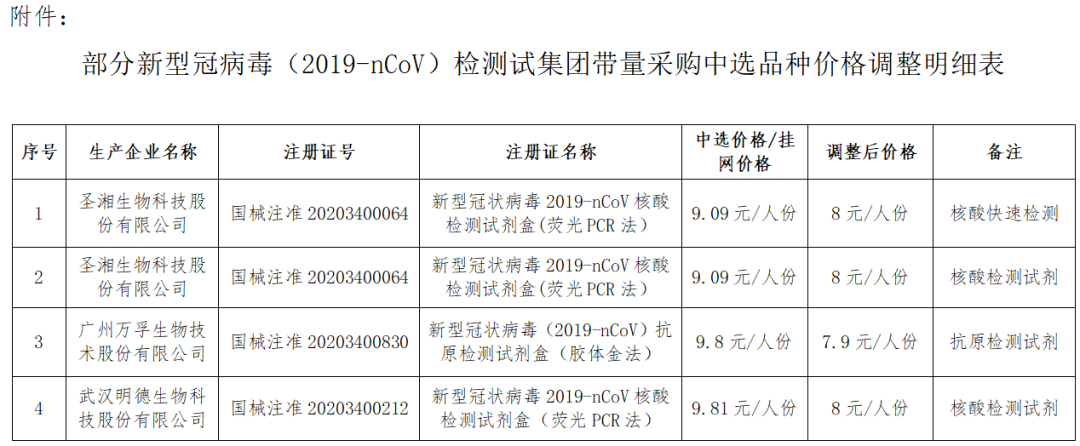 武汉明德生物科技股份有限公司中选品种新冠病毒( 2019-nCoV)核酸检测试剂盒(荧光PCR法)(国械注准20203400212)中选价格,由每人份9.81元调整为8元,详见附件。