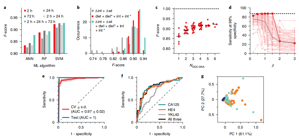 卵巢癌是全球第二常见的妇科恶性肿瘤,每年造成184000多人死亡。如果没有迹象表明癌症已经扩散到卵巢以外,5年生存率超过90%。然而,59%的病例在转移到远处后才被诊断出来,5年生存率下降到只有29%。早期发现卵巢癌并及时测量疾病进展和复发将显著改善预后。 传统上,血清生物标记物测量,如癌症抗原125(CA125)的测量,被用作一线检测和/或监测高危女性卵巢癌。其他补充血清生物标记物,如人类附睾蛋白4(HE4)、几丁质酶-3样蛋白1(YKL40)和间皮素,或一组生物标记物,比基于CA125的筛查具有更好的鉴别能力。然而,由于特异性有限和阳性预测值(PPV)较低,独立的生物标志物测量已被证明对存活率几乎没有益处。纵向CA125测量与经阴道超声检查相结合,可提高卵巢癌检测的PPV,但筛查的益处仍不明确。目前,没有筛查策略能够在足够早的阶段识别疾病,从而降低死亡率。 为了寻找克服诊断挑战的替代方法,研究团队研究了一种基于感知的策略。自然界已经进化出了识别和解释针对目标异质性的多维刺激的感知。感知是通过使用大量感官输入来实现目标识别,其中每个感官输入对目标的某些特征进行编码,并根据预先学习的目标模式库分析这些输入。例如,嗅觉使用一系列非特异性嗅觉受体,其反应模式由大脑中的神经网络处理,以识别气味。嗅觉感受器的数量相对较少(100-200),但通过感知,它们可以识别许多不同的气味,远远超过一对一识别的可能。对于这些气味,虽然每个信号产生的预测值相对较小,但作为一个整体处理的完整响应阵列仍能实现准确识别。 基于感知的方法已被用于根据DNA序列甲基化的不同模式、使用电子鼻的挥发性有机化合物、使用质谱的小代谢物、病理学图像分析、计算机断层扫描和磁共振成像数据对各种疾病进行分类。机器学习过程可以识别疾病特定的模式,这些模式太微妙或太复杂,无法被人眼或传统分析方法检测到,并有助于构建稳健的诊断模型。尽管人们努力开发一种利用病理学或放射成像数据进行基于感知的诊断筛查的通用方法,但在识别有效的疾病标记物以实现高灵敏度和高选择性以及临床实用可行性方面仍然存在挑战。 近日,来自美国多家知名大学和医学中心的研究团队在NATURE BIOMEDICAL ENGINEERING杂志上发表了一篇题为“Detection of ovarian cancer via the spectral fingerprinting of quantum-defect-modified carbon nanotubes in serum by machine learning”的文章,在文章中,研究团队设计了一个纳米传感器阵列和一个计算模型,该模型基于感知从患者血清样本中检测卵巢癌。为了传递生物流体的多种物理化学性质,研究团队使用OCC功能化单链DNA(ssDNA)的封装单壁碳纳米管设计了纳米传感器阵列。半导体单壁碳纳米管(SWCNTs)表现出固有的近红外荧光,环境响应性下降到单分子水平。SWCNTs (E11)的发射对介电环境、氧化还原扰动和静电电荷敏感。OCC-DNA纳米传感器的发射对从高级别浆液性卵巢癌(HGSOC)、其他非HGSOC疾病(包括缓解期患者、其他妇科疾病,如子宫内膜异位症和低度卵巢癌、非妇科癌症和其他疾病)患者和健康人身上采集的血清样本表现出不同的反应,但用传统的统计分析,光学反应并没有提供实质性的预测价值来区分这些患者。因此,研究团队训练了几个机器学习模型对HGSOC患者进行分类。SVM模型使HGSOC检测具有良好的灵敏度和特异性,准确率接近95%,优于传统的基于血清生物标志物的识别。研究团队还使用此方法评估已知卵巢癌血清生物标记物(包括CA125、HE4和YKL40)所赋予的预测价值。支持向量回归模型显示,传感器元件对这些标记物有定量反应,但它们并不能解释所有的预测值,这表明未知生物标记物在区分HGSOC中起着重要作用。 主要内容 OCC-DNA纳米传感器阵列 研究团队合成了一系列OCC-DNA纳米传感器,并用单链DNA文库将其封装,以将纳米传感器溶解在生物流体中。单链DNA序列的选择基于DNA的识别序列,该识别序列在SWCNT表面形成特定的包裹图案,从而形成多样的、高度定义的表面形态,从而赋予对局部环境的不同敏感性。由三个OCC和四个DNA序列的组合合成了十种不同的OCC-DNA纳米传感器。 为了确定从患者样本中提供最多样化反应的最小OCC-DNA组合,测量了OCC DNA对HGSOC患者和健康个体血清样本的荧光光谱反应。将两种条件下的四份血清样品与10种不同的OCC DNA孵育2h,获得OCC-DNA复合物的荧光光谱。研究团队选择了六个对健康组和癌症组的反应有统计学显著差异的OCC-DNA纳米传感器,其HGSOC和健康组之间的差异具有统计学意义(P<0.10)。 OCC-DNA纳米传感器阵列 图片来源:Nature biomedical engineering 用于HGSOC分类的机器学习算法优化 研究团队将OCC-DNA传感器阵列暴露于215份患者血清样本中,并构建了一个包含由血清环境引起的光谱特征变化的数据集。这组血清样本收集自49例HGSOC、51例其他妇科疾病(如子宫内膜异位症和低度卵巢癌)、29例非妇科癌症、25例缓解期癌症患者(包括7例HGSOC)和61例健康献血者。研究团队多次优化了机器学习算法,最后得到的SVM模型在98%的特异性下产生87%的敏感性。 为了进一步评估传感器阵列和算法的鲁棒性,研究团队在相同条件下合成了一批新的OCC DNA,并收集了传感器阵列对54个患者样本的独立测试集的响应数据。为了评估模型在各种医疗条件下的性能,从不同的患者中取样测试集,包括7例HGSOC、5例其他妇科疾病、32例非妇科疾病和10例