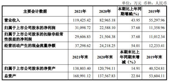 拱东医疗4月17日晚间发布2021年年度报告,公司全年营业收入首次突破10亿元,达到119425.42万元,同比增长43.95%;归属于上市公司股东的净利润31098.72万元,同比增长37.68%;扣除非经常性损益后的归属于母公司所有者净利润29606.83万元,同比增长37.68%;公司实现营业收入、净利润、总资产、净资产皆创历史新高。 主要会计数据和财务指标 分季度的主要会计数据 2021年公司实现营业收入 119,425.42万元,较上年同期增长 43.95%;实现归属于上市公司股东的净利润 31,098.72万元,较上年同期增长 37.68%;实现扣除非经常性损益后的归属于母公司所有者净利润 29,606.83万元,较上年同期增长 37.68%。 截至报告期末,公司资产总额为 168,991.12万元,负债总额为 30,187.72万元,所有者权益总额为 138,803.40万元,资产负债率为 17.86%。公司的资产流动性、偿债能力、现金流状况良好,各项财务指标健康。 公司主要业务 1、经过多年在国内体外诊断配套耗材行业的布局,公司已经与国内IVD生产企业中的半数以上上市公司及众多其他中小企业建立了业务合作关系。 2、在国际市场,公司已经与多家医用耗材领域国际知名客户,如McKesson、IDEXX、Medline、Thermo Fisher、As One、Henry Schein、Cardinal等企业形成了长期稳定的合作伙伴关系 公司2021年度利润分配预案 1.公司拟向全体股东每10股派发现金红利13.80元(含税)。截至本利润分配预案披露之日,公司总股本为112,627,120股,以此计算合计拟派发现金红利155,425,425.60元(含税),占合并报表中归属于母公司股东净利润的49.98%,剩余未分配利润结转至下一年度。 2.如在本利润分配预案披露之日起至实施权益分派股权登记日期间,公司总股本发生变动的,公司拟维持每股分配比例不变,相应调整分配总额。 3.本利润分配预案尚需提交公司股东大会审议。 |