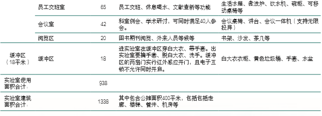3. 基础设施、功能分区、占地面积、功能用途及设备设施情况:检验科临床微生物实验室独立建筑面积1338平米,各功能房间使用面积938平米包括实验用房631平米,办公用房289平米,缓冲区18平米,实验室功能分区详见图1,实验室各功能分区、占地面积、功能用途及主要设备设施也在表2中做了详细描述。