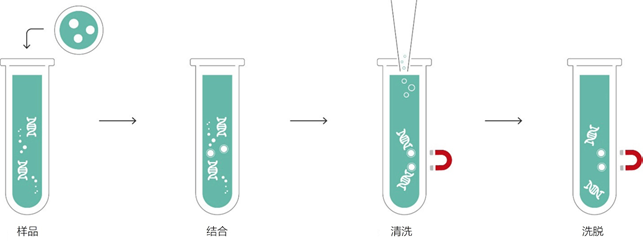 使用磁珠很简单,不需要危险的溶剂,释放DNA或RNA只需调整缓冲液的特性(图1)。这种简单性也使得磁珠很适合在高通量应用中实现自动化。