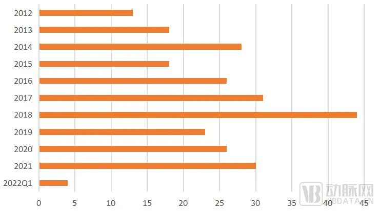 FDA对于真正意义上的创新医疗器械,即目前市场上没有与之“实质相同”的产品,而又非高风险的器械,采用De Novo分类方式进行审查。像首个AI产品、首个自适应助听器、首个用于处方治疗的app等,FDA都是用此方式进行批准的。 整个2021年,总共有30款产品通过De Novo方式获批,2022年截至3月底仅有4款产品。 从FDA获批的产品中可以看出,医疗器械的创新,除了依赖临床研究和科研探索的有机结合,也离不开包括人工智能、大数据、虚拟技术、新型传感器以及脑机接口等数字化技术的应用。动脉网试着梳理其中脉络,摸清医疗器械创新的趋势。 从获批器械看企业发展 可以从De Novo过去10年的获批数量看出,除了2018年的44件之外,其余年份很难超过30件,10年间平均每年25件左右,由此可见创新之艰难。 De Novo分类方式过去10年获批数量