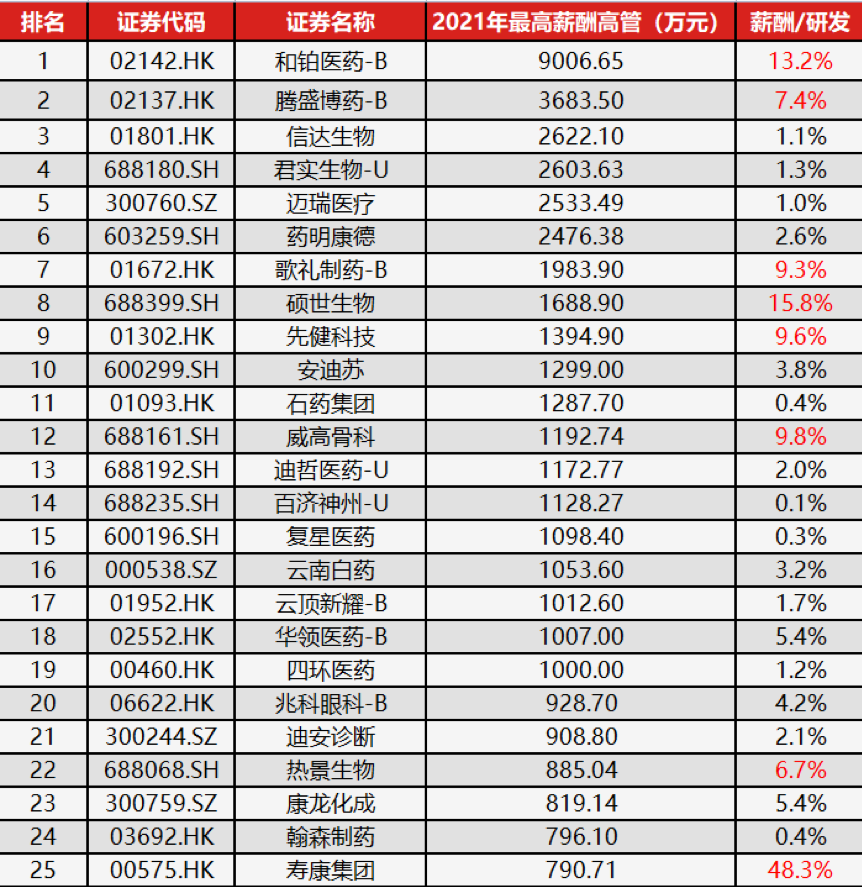 TOP 100药企高管的平均薪酬为797万元,上榜门槛为323万元。其中,有19家公司其薪酬最高高管的工资已经超公司总体研发成本的6%,但也有很多上榜高管其工资占比不到研发总支出的1%。