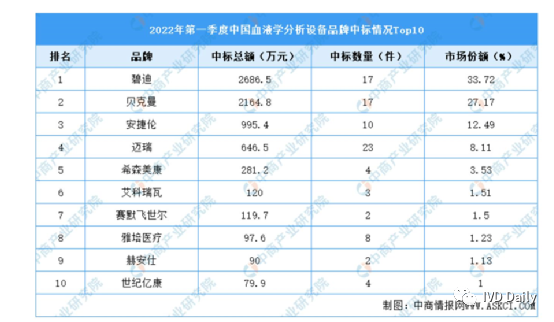 日本的希森美康株式会社(Sysmex)创建于1968 年,原名为日本东亚医疗电子株式会社,主要从事体外诊断(IVD)设备、试剂及相关软件的研发、生产和销售,是全球知名的临床检验综合方案提供商。希森美康在2019年全球IVD市场的收入排名第八,是全球十大IVD 公司中唯一一家亚洲公司。希森美康是日本第一家开发出自动血细胞计数仪的公司,2020 财年血液检验产品的销售收入为1873亿日元,在全球血液学检验领域的市占率超过50%,其中在中国三级医院的市占率超过90%,算得上是该板块的绝对龙头。目前希森美康血液学设备产品线品类丰富,从紧凑型即时检测(POCT)分析仪到全自动血液学分析仪一应俱全。公司从1979 年推出关键产品CC-720 后,血液分析仪产品线主要分成两条支线布局,一条是功能全面、性能领先的高端旗舰产品,如XN系列;另一条是轻便快速、性价比优先的产品,如XQ系列。全自动模块式血液体液分析仪XN系列是公司目前的主力旗舰机型,于2011年推出,是高端血液流水线的销量冠军。XN 系列具有仪器模块化和功能模块化两大特点,能够实现全自动精密控制,功能完备、处理效率高。除此以外,XN 系列较以前机型更加节约试剂用量并可自动识别试剂,而且采用了新的血小板检测技术,提高了低密度白细胞检测精度。希森美康一直将亚太市场摆在十分重要的战略位置上。从1994 年就开始在亚太地区(新加坡)设立分支机构,1995 年在中国设立合资公司;2000 年正式成立上海子公司,进军中国市场。2006 年公司为未来业务增长制定了三大发展战略:全球利基市场第一、聚焦亚太、聚焦生命科学。经过十多年的经营,这种布局终于开花结果。2010 年以来,公司主要的营收增量贡献来自于亚太地区,更具体地来看,增量主要来自于中国市场。希森美康在中国销售4 大类检测设备:血液、血凝、尿液和免疫,而公司在这4 大领域的销售增长基本都集中在中国。尤其值得关注的是,尿液、免疫分析设备在中国市场的销售远好于其他国家,尿液领域是因为在中国的接受程度更高,免疫领域则很大程度受益于希森美康在中国的销售渠道实力。通过上文对希森美康从诞生到成长为国际细分龙头历程的分析,小编认为在强者恒强的行业发展趋势下,厂商应从供需两种角度对产品、销售、研发等方面进行战略布局,锚定目标市场需求制定优势发展策略,尤其是具有中国特色操作化的需求定制,模块化设计,积木式的产品组合。这些经验或许对我们发掘中国IVD行业的国际化龙头有所帮助。来自中商情报网的资料显示,2022年第一季度,共监测到197条血液学分析设备中标数据,涉及130家采购单位和45个品牌商,采购数量和总额分别为224件和9408.0万元。2021年第一季度至2022年第一季度期间,血液学分析设备中标总额最高位为2021年第三季度,达到2.8亿元,中标数量为497件;2022年第一季度中标金额同比下降47.0%,环比下降62.4%。(全国各地散发疫情影响不小)据中标结果显示,流式细胞仪的中标金额及数量居首,中标金额为7326.1万元,中标数量为63件;其次是血细胞分析仪和凝血分析仪,中标金额分别1172.3万元和523.3万元,中标数量分别50件和48件。根据中标结果,2022年第一季度血液学分析设备招标较活跃的地区是浙江省,采购金额为1526.3万元,占比20.44%;安徽省以采购金额982.4万元排在第二,占比13.16%;江西省排在第三位,采购金额为859.4万元,占比11.51%。从中标厂家看,这里只讨论血球。迈瑞2022年一季度中标总额达646.5万,中标23件,市场份额达8.11%;希森美康一季度中标281.2万,中标4件,市场份额占比3.53%。从这一数据不难看出血球领域迈瑞已经真正实现了超越进口,成为第一。国产替代正当时!正视与进口的差距,我们也不必妄自菲薄,辛勤耕耘,必有开花结果的那一天。PS: 2022年一季度已经圆满结束,战绩好坏不予以评价,生活总该继续,前面的日子还长着呢···