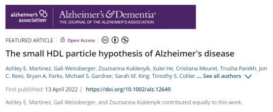 [1]Martinez AE, Weissberger G, Kuklenyik Z, et al. The small HDL particle hypothesis of Alzheimer's disease. Alzheimers Dement. 2022 Apr 13. doi: 10.1002/alz.12649. Epub ahead of print. PMID: 35416404.