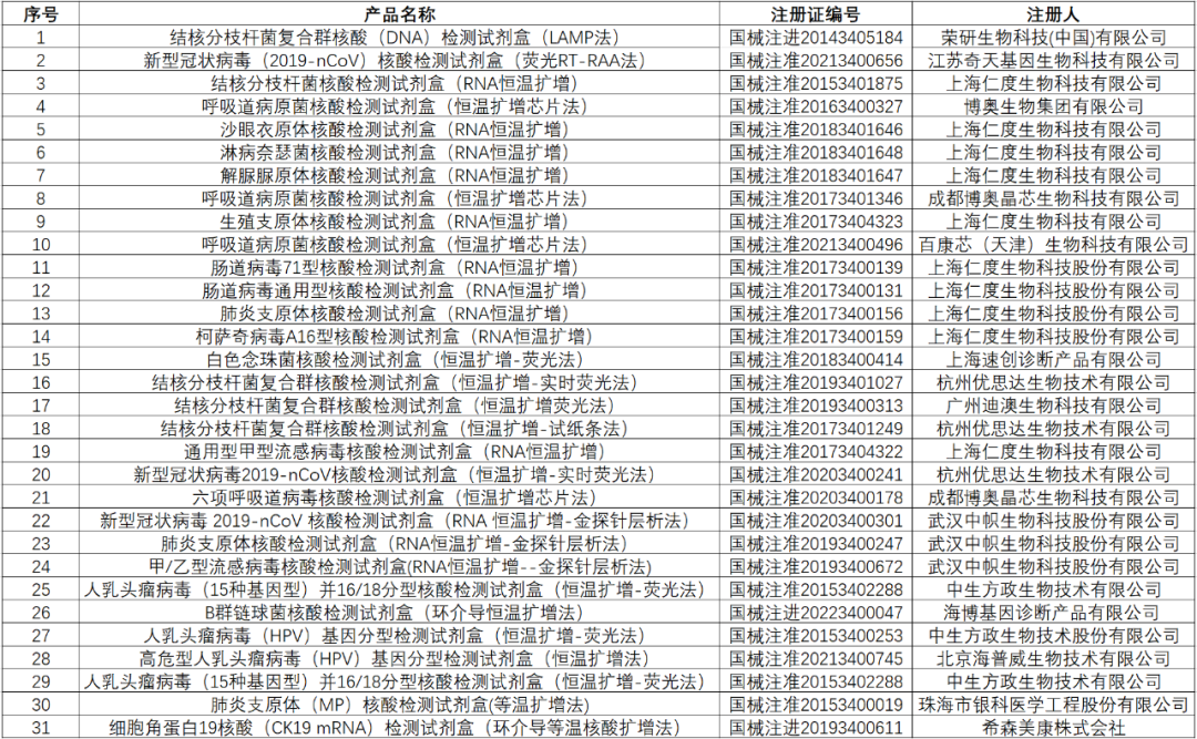 NMPA共批准了31款试剂盒,境内产品占主要,具体数据见图15,涉及17家公司,具体数据见表6。这31款产品中有30款是病原微生物检测相关试剂,这也符合其技术特点。