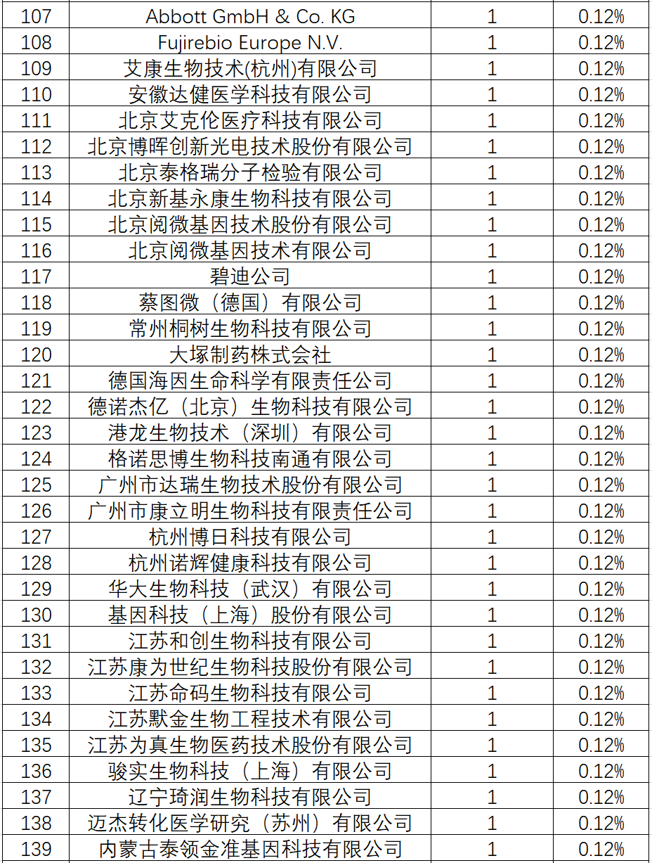 不同的公司根据自身情况有着不同的商业布局,有的只设计开发PCR试剂,有的公司只设计开发PCR仪器(开放性平台),而有的公司则是同时布局PCR试剂和PCR仪器,目前共有22家公司同时布局PCR试剂和PCR仪器,具体数据见表5。近年来随着IVD行业的快速发展,其他IVD细分领域(非核酸扩增领域)两手布局(试剂+仪器)的公司也在变多,后续在其他细分领域的分析报告中会阐述。