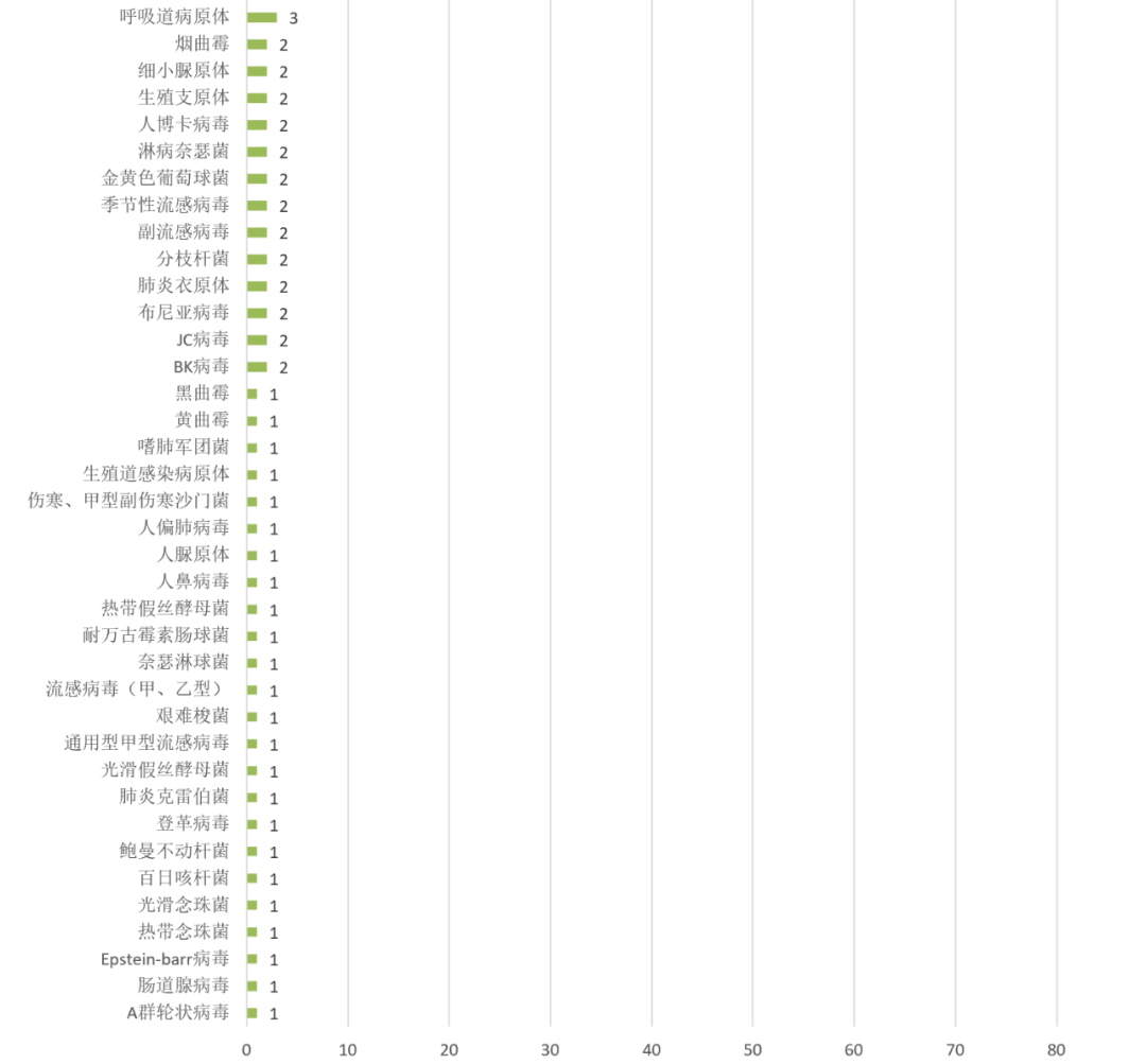 从图8可以看出,病原体检测相关试剂占总PCR试剂盒数量的69%(不包含新冠),这其中共涉及到75种致病性病原体,覆盖面很广,排名前三的分别是:HPV(81项)、HBV(71项)和肠道病毒(46项),具体数据见图10。