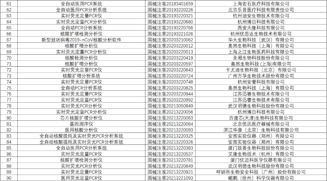 PCR检测方法根据其原理,主要分成两部分:1. 样本核酸提取/纯化;2. 扩增与分析。有的PCR仪器1和2都可以进行(暂定义为全自动PCR仪器,一体化检测),有的PCR仪器只能进行2(暂定义为非全自动PCR仪器)。截止到目前,全自动PCR仪器有15款获证,已获证的PCR仪器现状如图12,表4。