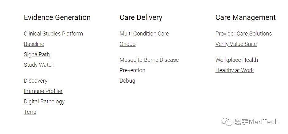 自2022年2月以来,Patel刚担任FDA担任全球战略与创新首席数字健康官,此前曾担任 FDA设备和放射健康中心主任。如今在Alphabet(纳斯达克股票代码:GOOGL)子公司 Google 担任新职务,他表示将支持Google Health的使命“帮助数十亿人变得更健康”,因为他在整个公司的健康团队中建立了数字健康和监管战略。“作为一名‘技术人员’(在成为 FDA 政策专家之前),致力于前沿解决方案一直是我整个职业生涯的重点,”他在 Linkedin 上说。“这种以技术为导向的思维方式继续引导我努力帮助将数字健康从一个充满希望的概念变为现实。在我在FDA的整个任期内,我最大的愿望一直是让所有人都能获得和公平的数字医疗保健。我经常谈到数字健康有可能成为改变游戏规则的人,预示着医疗保健的新时代——一个无处不在并准备为所有人提供护理的时代,包括预防和预测疾病,让人们保持健康并远离医院。”帕特尔只是最新一个进入Alphabet和联邦监管机构之间新旋转门的人。现任FDA专员Robert Califf是前Alphabet高级顾问。谷歌的首席卫生官凯伦·德萨尔沃(Karen DeSalvo)是国家卫生信息技术协调员办公室(Office of the National Coordinator for Health Information Technology)的前任主任。关于谷歌在数字健康领域的布局,谷歌云医疗科技板块的负责人Alissa Hsu Lynch(之前在强生工作)2022年2月接受访谈时曾这样描述: 首先是利用数据和人工智能 (AI) 快速应对新出现的危机。COVID-19加快了医疗保健行业的创新步伐,包括开发疫苗、采用远程医疗平台以及使用数据和人工智能解决紧迫的公共卫生问题。例如,谷歌与 HCA Healthcare 合作,努力联合私营企业、公共部门和国家医院创建COVID-19国家响应门户,促进有关大流行及其传播方式的安全数据共享,以帮助医院和社区最好地准备和响应。它提供了可用和正在使用的 ICU床位和呼吸机数量,以及 COVID-19 测试结果和地理区域等信息,直至县级。谷歌云还创建了一个扩展的虚拟代理,通过帮助人们安排疫苗预约并通过虚拟代理以多达 28 种语言和方言通过聊天、文本、网络、移动或电话提出常见问题,从而促进疫苗公平。其次是从海量数据中挖掘洞察力。Google Cloud正在帮助组织获得来自多个系统和来源的数据的集中、整体视图。脓毒症是对感染的自身免疫反应,是美国医院治疗的最致命和最昂贵的疾病之一,每年影响大约 750,000 名美国人。早期发现和预防可以极大地挽救生命、金钱和资源,但没有可靠的方法来快速诊断败血症。埃默里大学的研究人员使用 Google Cloud 创建了一种算法,该算法使用 71 个因素在 4 到 6 小时内以 85% 的准确率预测患者败血症的发作,从而缩短了诊断时间。三是推进生物科技创新。DeepMind 的 AlphaFold 机器学习系统最近帮助解决了 50 年来一直是生物学领域的重大挑战的蛋白质结构问题。通过实验确定蛋白质结构是一个耗时且艰苦的过程,但 AlphaFold 证明人工智能可以在几分钟内准确预测蛋白质的形状,精确到原子精度。重要的是,世界各地的研究机构现在可以利用 AlphaFold 更好地了解复杂疾病并加速新疗法的开发,例如严重影响世界贫困地区的挽救生命的疗法。我们现在让 AlphaFold 可供全球数据科学家在 Google Cloud 上使用。四是用人工智能实现更快、更准确的诊断,提高医疗护理服务的生产力和效率,并改善患者获得更好护理和结果的机会。Google 在我们业务的其他领域(例如 Google Image Search 和 Google Photos)拥有多年利用计算机视觉的专业知识,我们现在正与医疗保健组织合作,帮助他们使用相同的工具加速医学成像人工智能/机器学习的开发谷歌的力量。随着越来越多的医学图像被数字化并转移到云端,公司拥有了处理 PB 甚至 EB 数据所需的安全、可扩展的存储——图像文件非常大——以及执行高级分析和 AI 模型所需的计算能力训练。谷歌与许多组织合作,应用人工智能来帮助医生优先审查关键病例,提供“第二意见”以支持治疗决策,并扩大在医生短缺地区进行筛查的机会。虽然它仍处于医学成像人工智能采用曲线的早期阶段,但它确实具有改善患者护理和挽救生命的潜力。五是创建患者的360度视图,或更全面的纵向患者记录。在整个护理过程中连接数据使医疗保健生态系统能够更好地了解是什么推动了护理和结果的可变性。目前,这主要集中在来自电子病历、实验室结果和其他临床数据的数据上,并且不包括来自医疗设备的大量数据。随着公司投资于联网和智能设备——我指的是医疗设备以及可穿戴设备和传感器等消费设备——这将提供不仅可以检测和管理健康状况,还可以预测和预防疾病并提供更个性化的服务关心。然而,完成纵向患者记录需要的是设备数据互操作性。设备没有通用的数据标准,它们会生成大量流数据,使数据难以使用。在去年的哈里斯民意调查中,近 90% 的医生表示,他们正在寻找将所有患者数据整合到一个地方的方法,以便更全面地了解健康状况。在 Google Cloud,我们正在努力使全球的健康数据可访问、可互操作且对组织有用,以帮助加速为患者提供更好的洞察、护理和结果。Verily原属于Google X实验室的Life Sciences,后来改名为Verily。业务包括:1. 证据生成:目标是通过临床试验创新加快证据生成。它的第一项举措是基线健康研究,与杜克大学医学院和斯坦福大学医学院合作,旨在收集全面的健康信息,以更好地了解健康